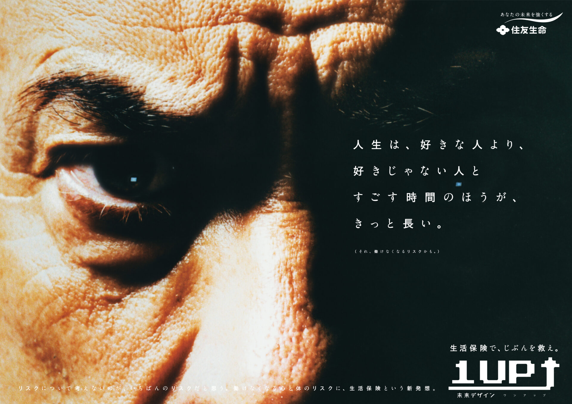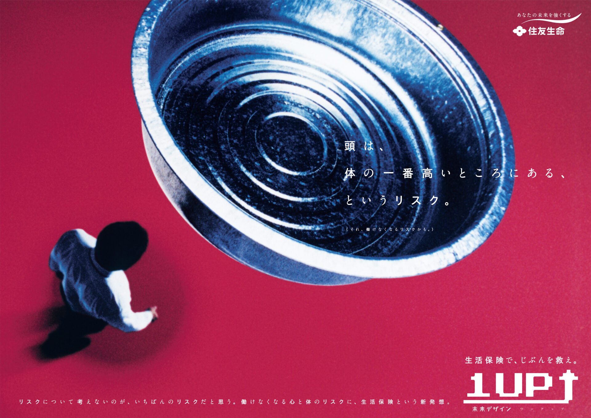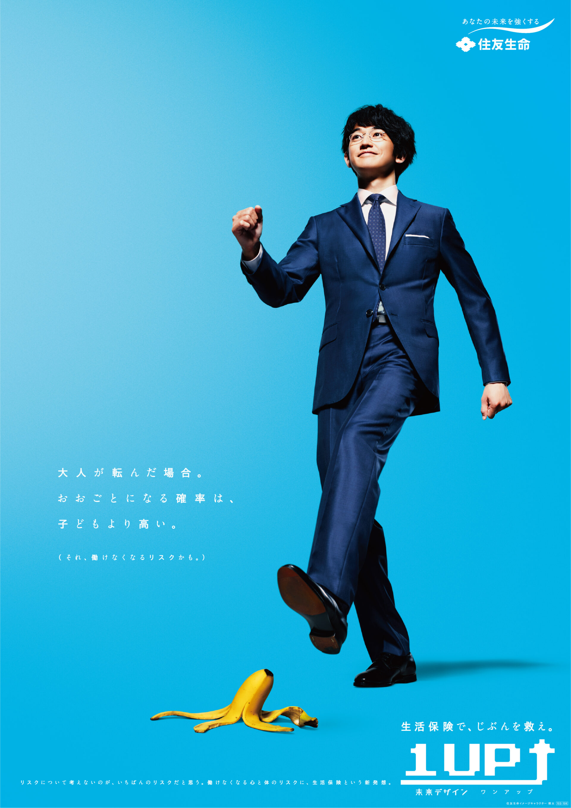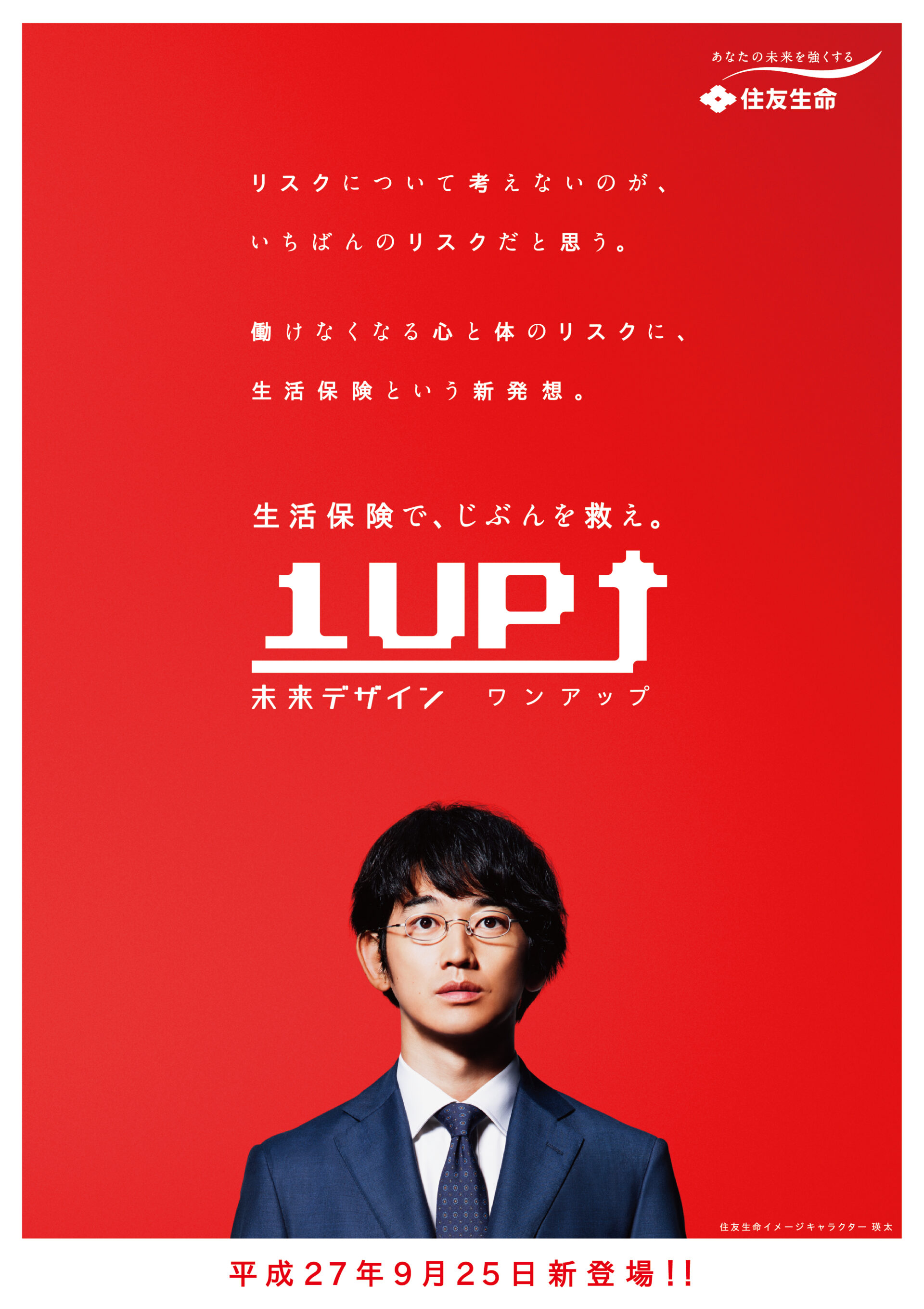 Designer : toruIMAI CreativeDirector : tetsuroASO ArtDirector : kengoKATO CopyWriter : kinyaOKAMOTO Photographer : keibunMIYAMOTO Actor : eitaNAGAYAMA Advertising insurance poster SUMITOMO LIFE TUGBOAT SUMITOMO LIFE INSURANCES : 1UP