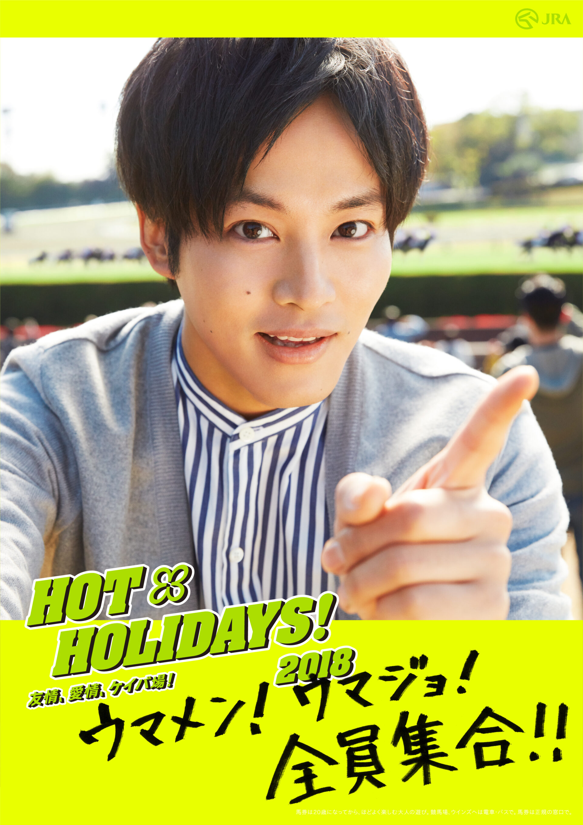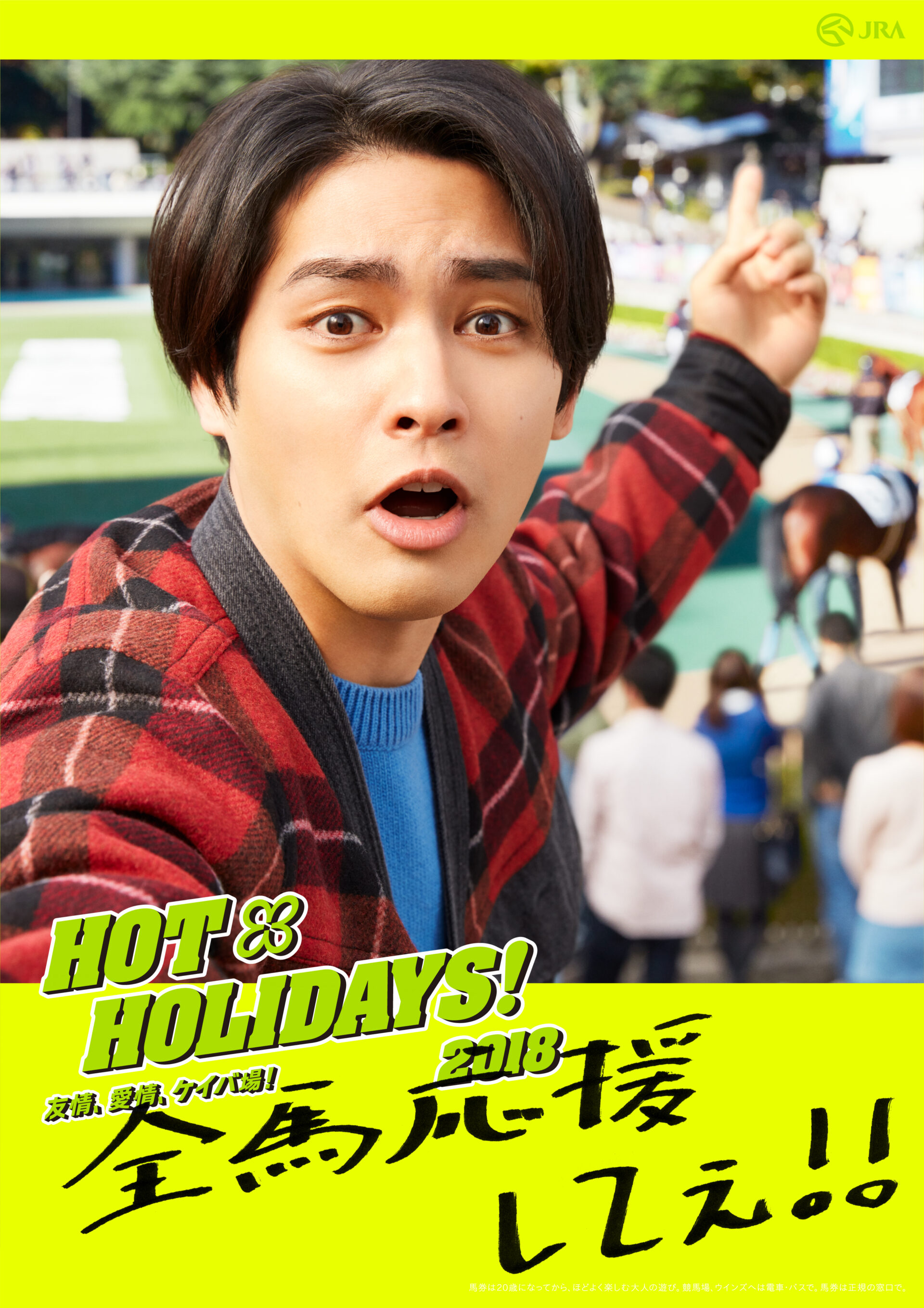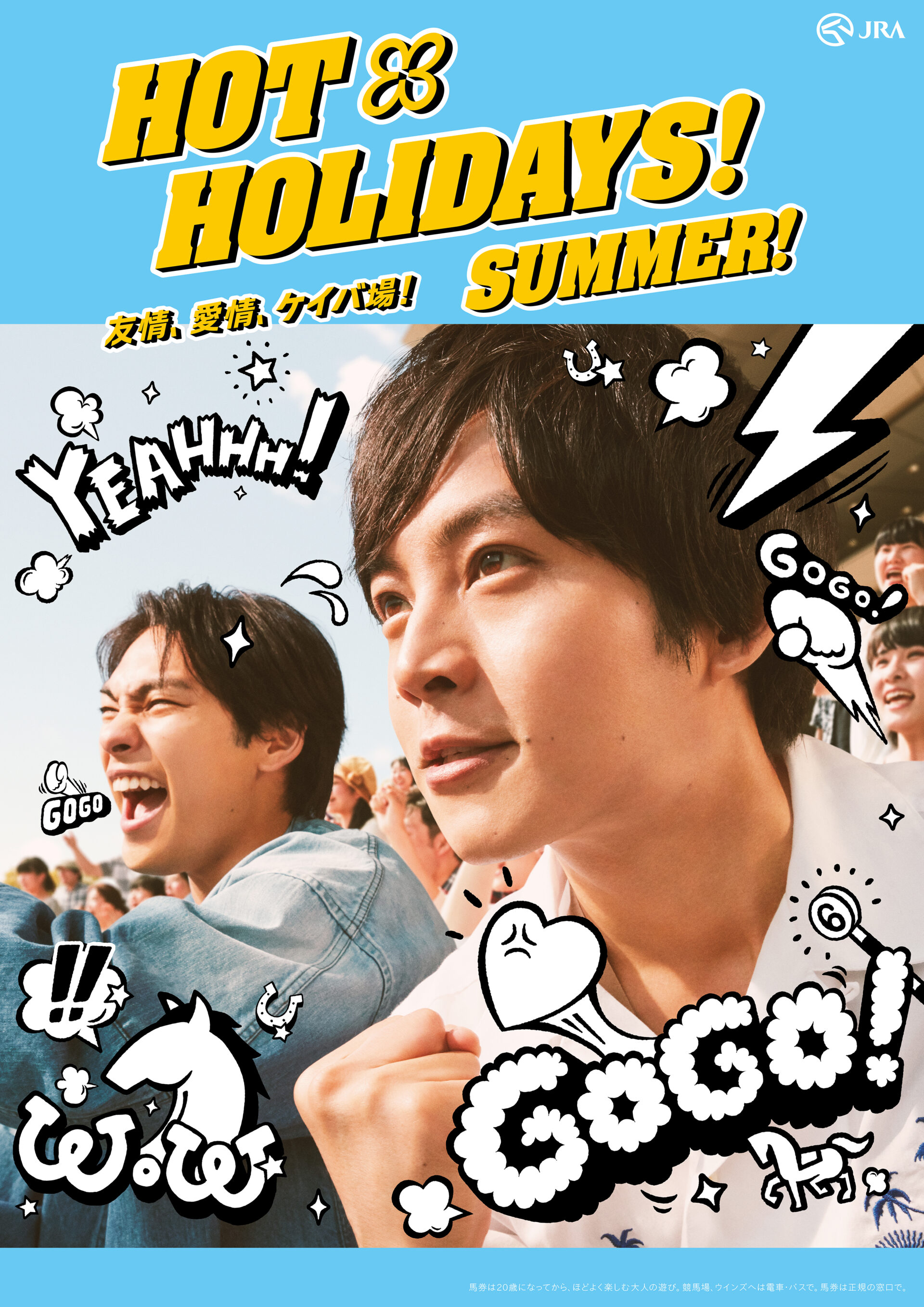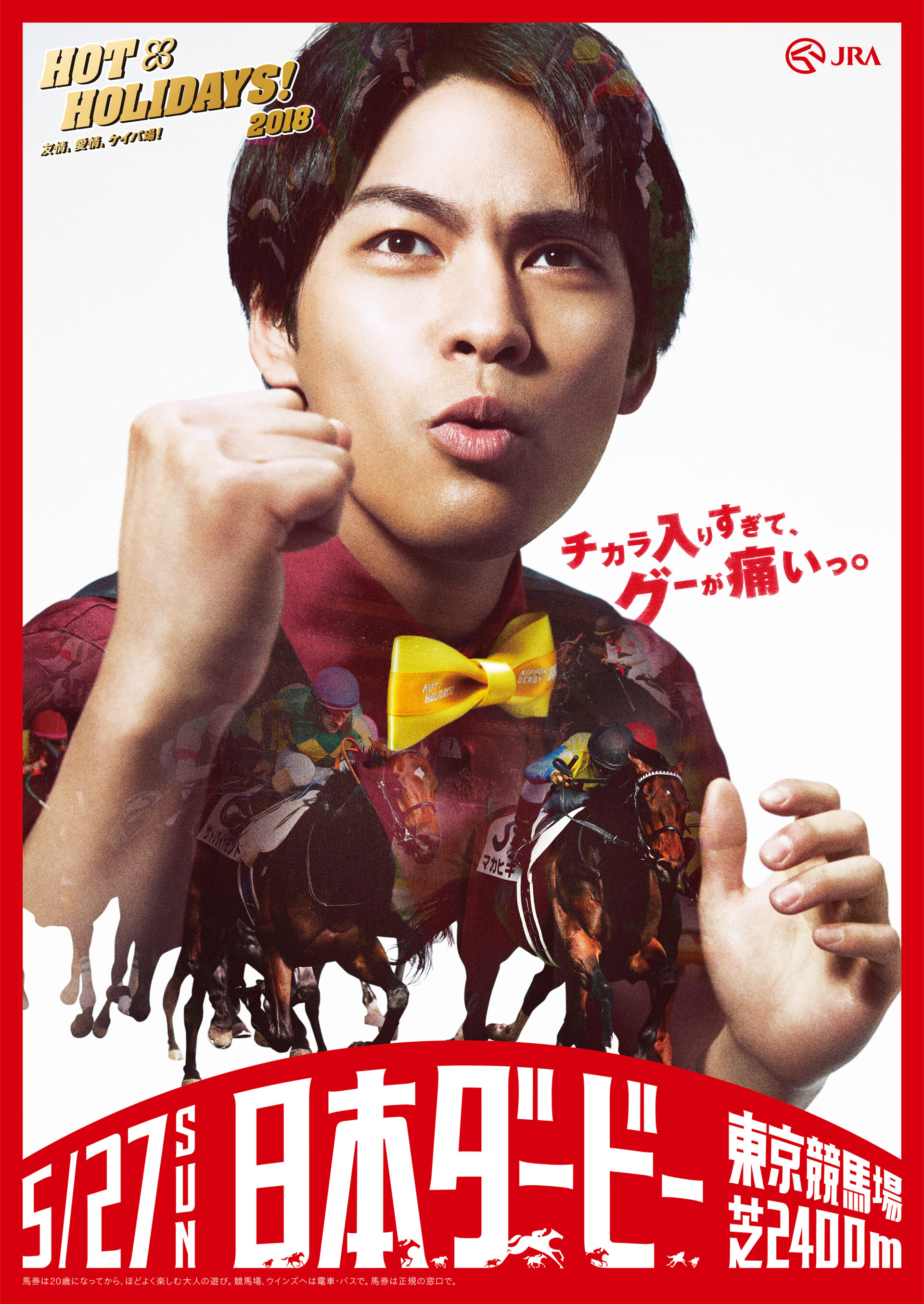 Designer : toruIMAI CreativeDirector : tetsuroASO ArtDirector : kengoKATO Photographer : munetakaTOKUYAMA Actor : yuyaYAGIRA Advertising horse racing JRA poster TUGBOAT JRA : HOT HOLIDAYS! 2018