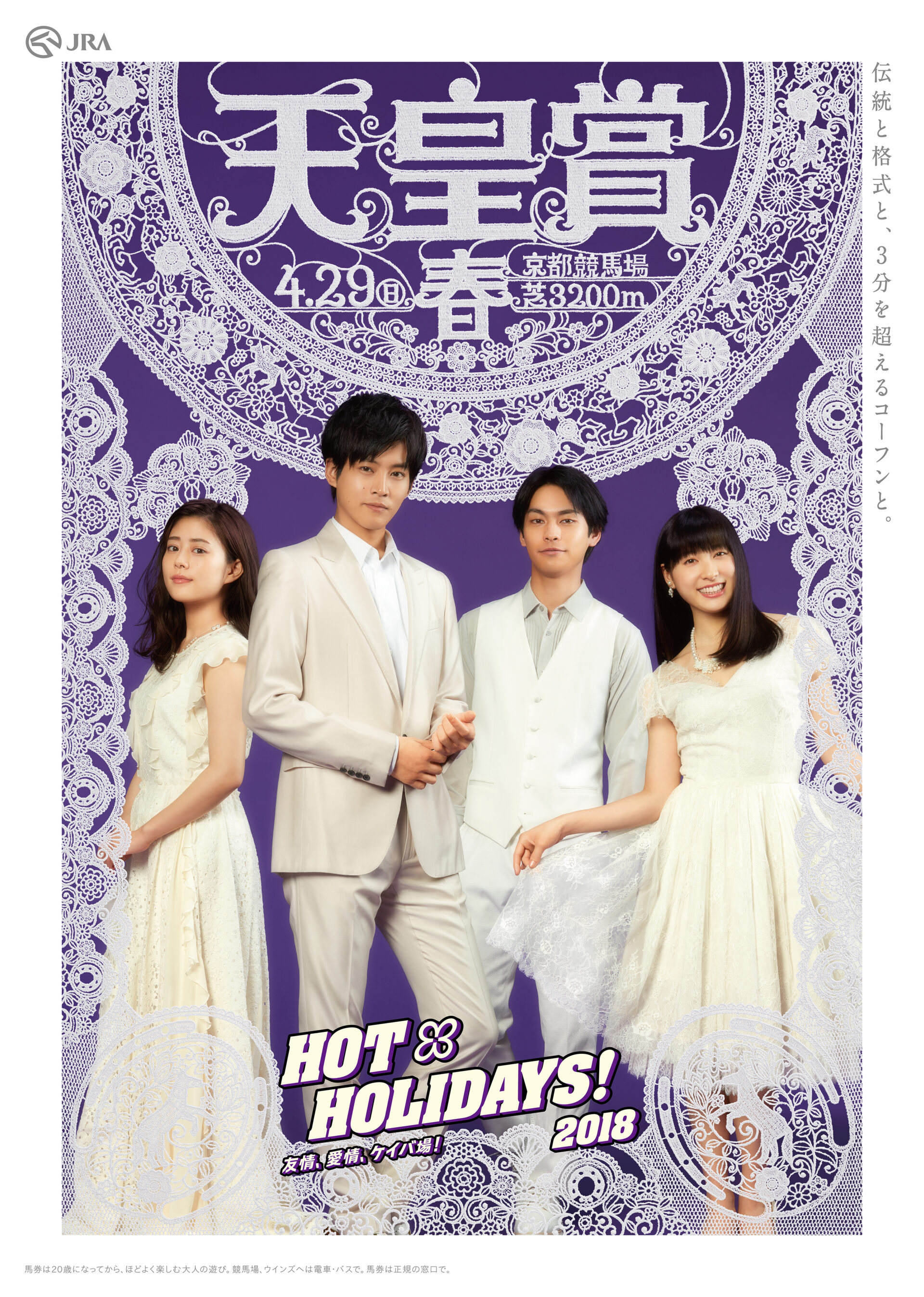 Designer : toruIMAI CreativeDirector : tetsuroASO ArtDirector : kengoKATO Photographer : munetakaTOKUYAMA Actor : toriMATSUZAKA,mitsukiTAKAHATA,yuyaYAGIRA,taoTSUCHIYA Advertising horse racing JRA poster TUGBOAT JRA : HOT HOLIDAYS! 2018