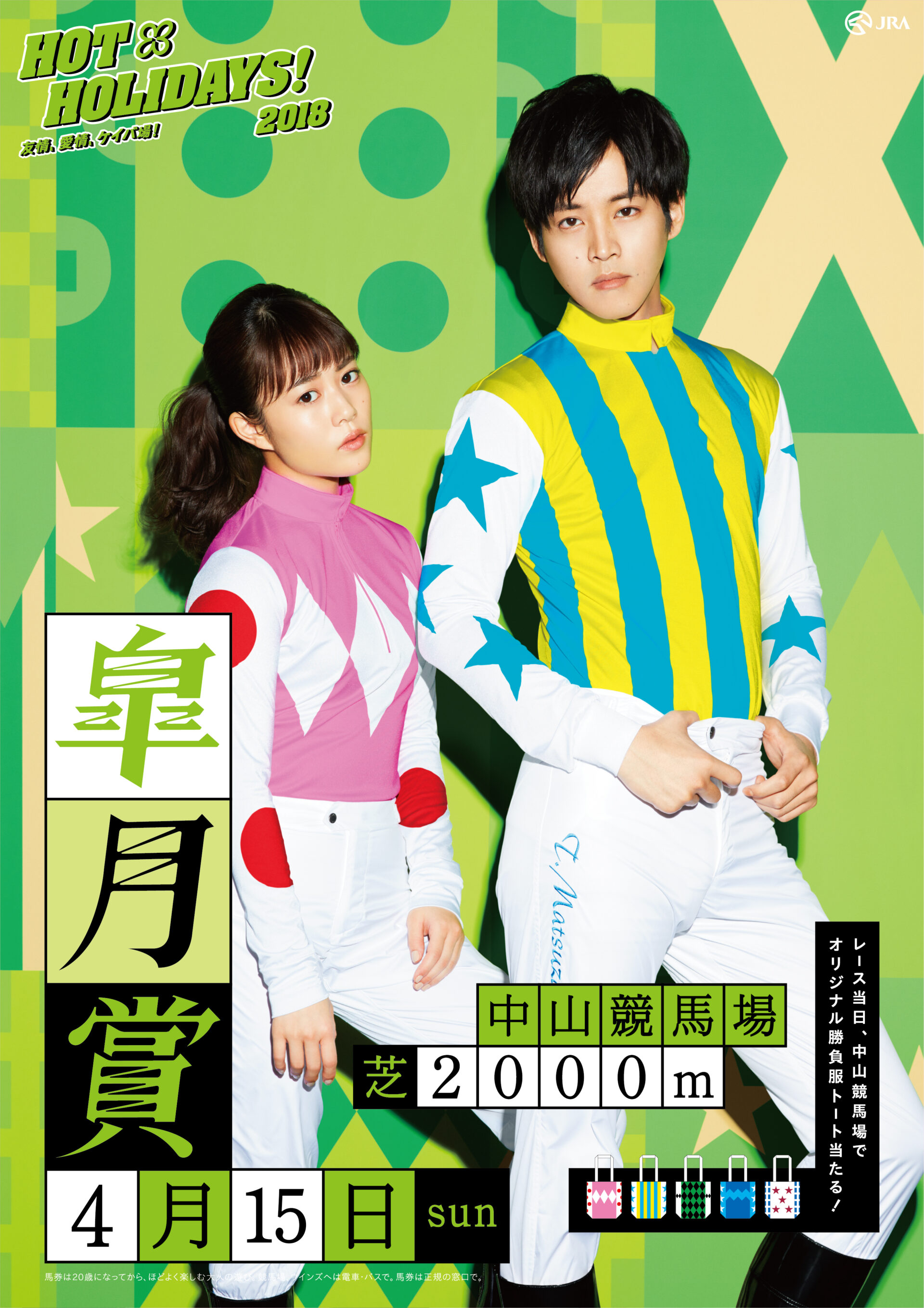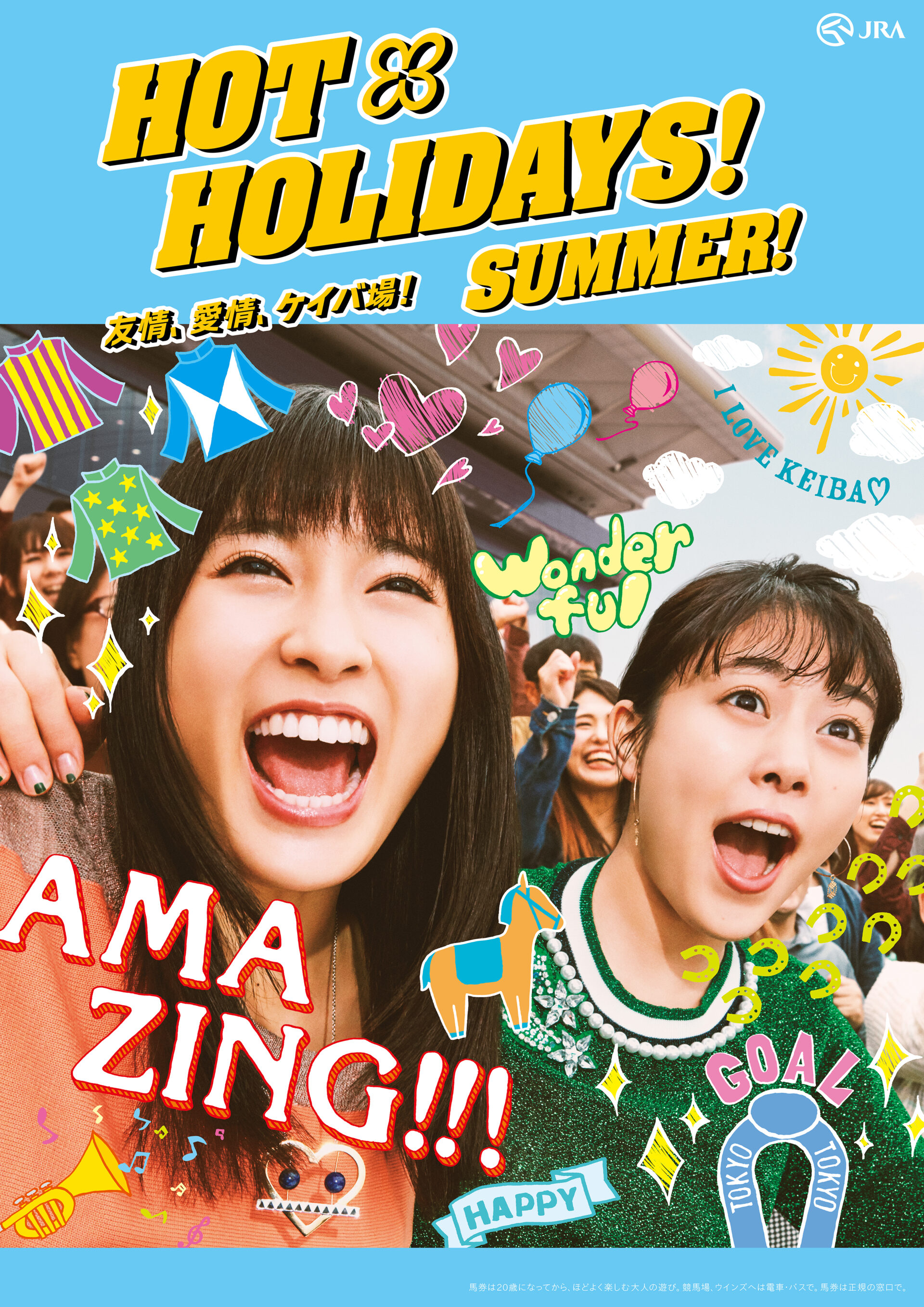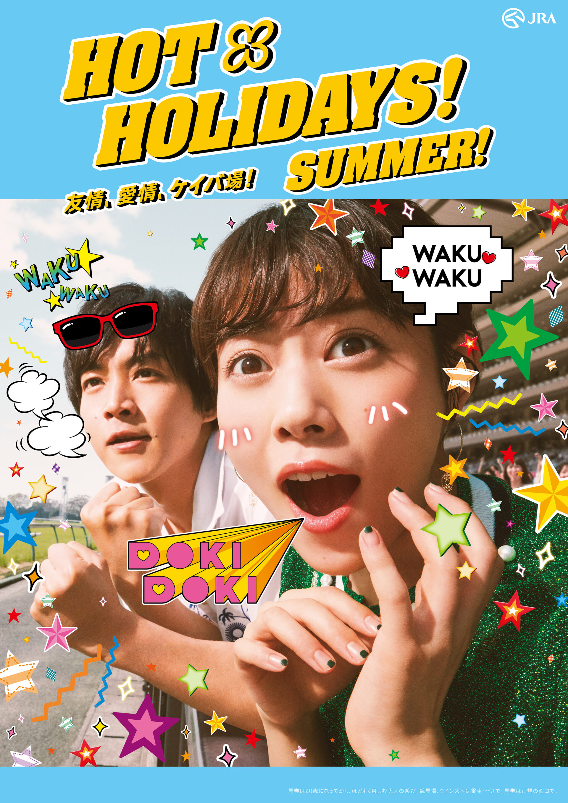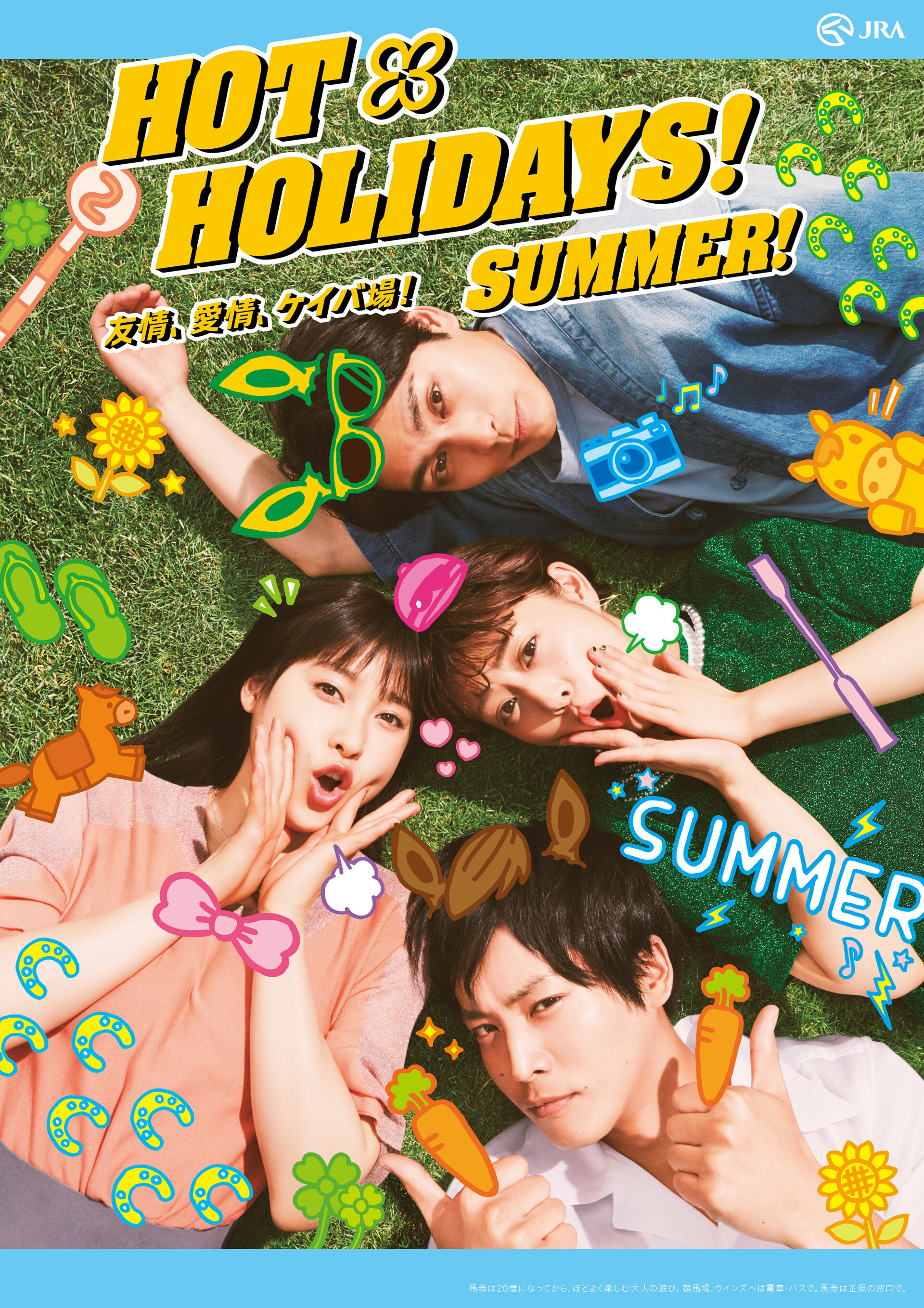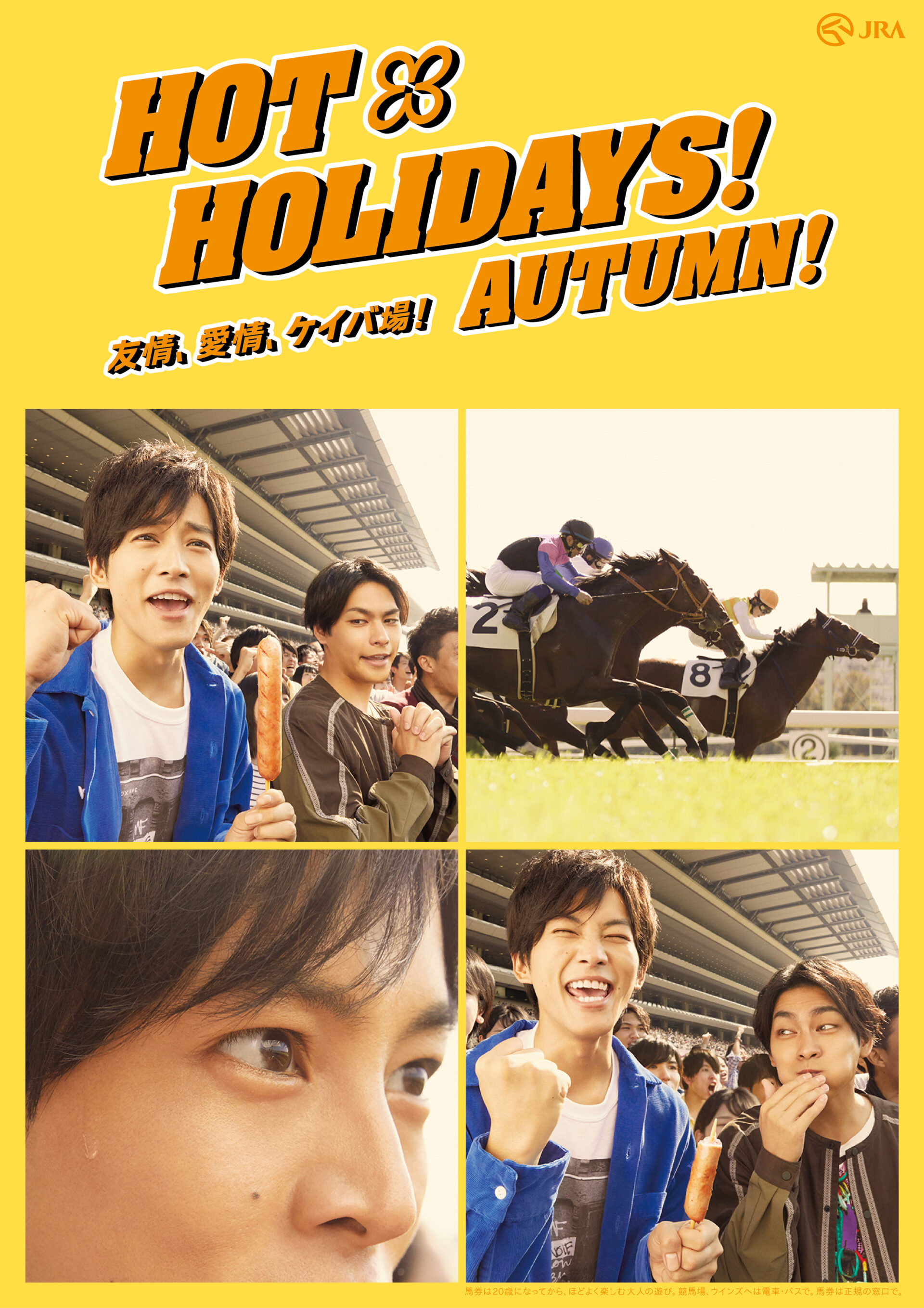 Designer : toruIMAI CreativeDirector : tetsuroASO ArtDirector : kengoKATO Photographer : munetakaTOKUYAMA Actor : mitsukiTAKAHATA,taoTSUCHIYA,amakoINTER Advertising horse racing JRA poster TUGBOAT JRA : HOT HOLIDAYS! 2018