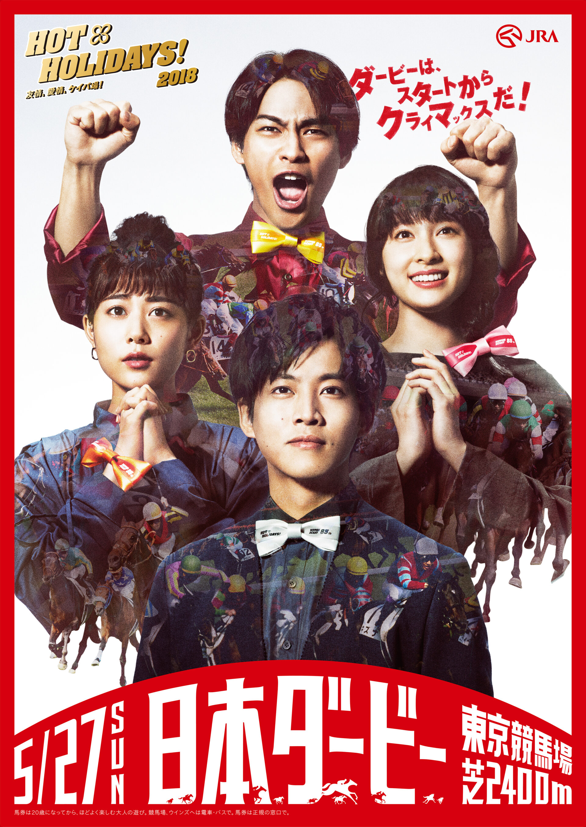 Designer : toruIMAI CreativeDirector : tetsuroASO ArtDirector : kengoKATO Photographer : keisukeANZAI Actor : toriMATSUZAKA,mitsukiTAKAHATA,yuyaYAGIRA,taoTSUCHIYA Advertising horse racing JRA poster TUGBOAT JRA : HOT HOLODAYS!!