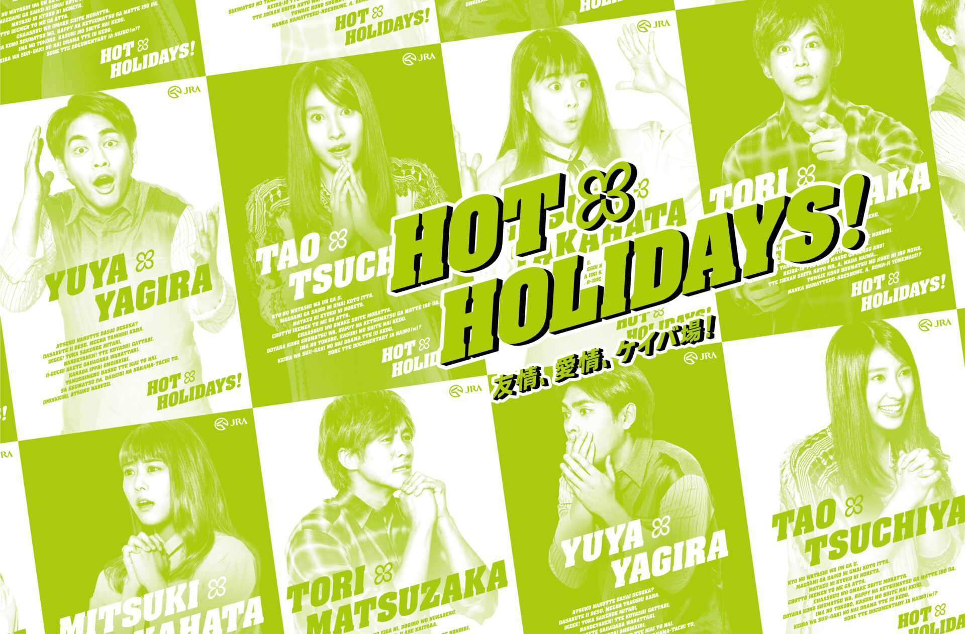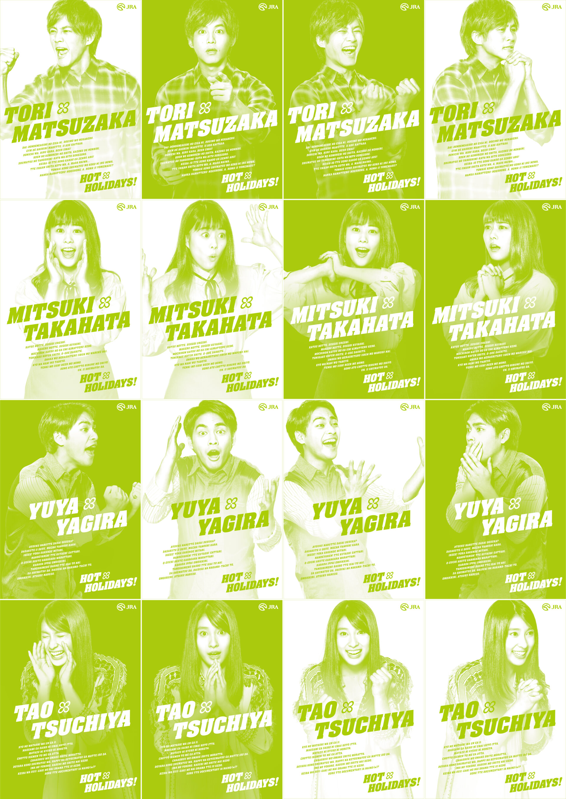 Designer : toruIMAI CreativeDirector : tetsuroASO ArtDirector : kengoKATO Photographer : keisukeANZAI Actor : toriMATSUZAKA,mitsukiTAKAHATA,yuyaYAGIRA,taoTSUCHIYA Advertising horse racing JRA poster TUGBOAT JRA : HOT HOLIDAYS!