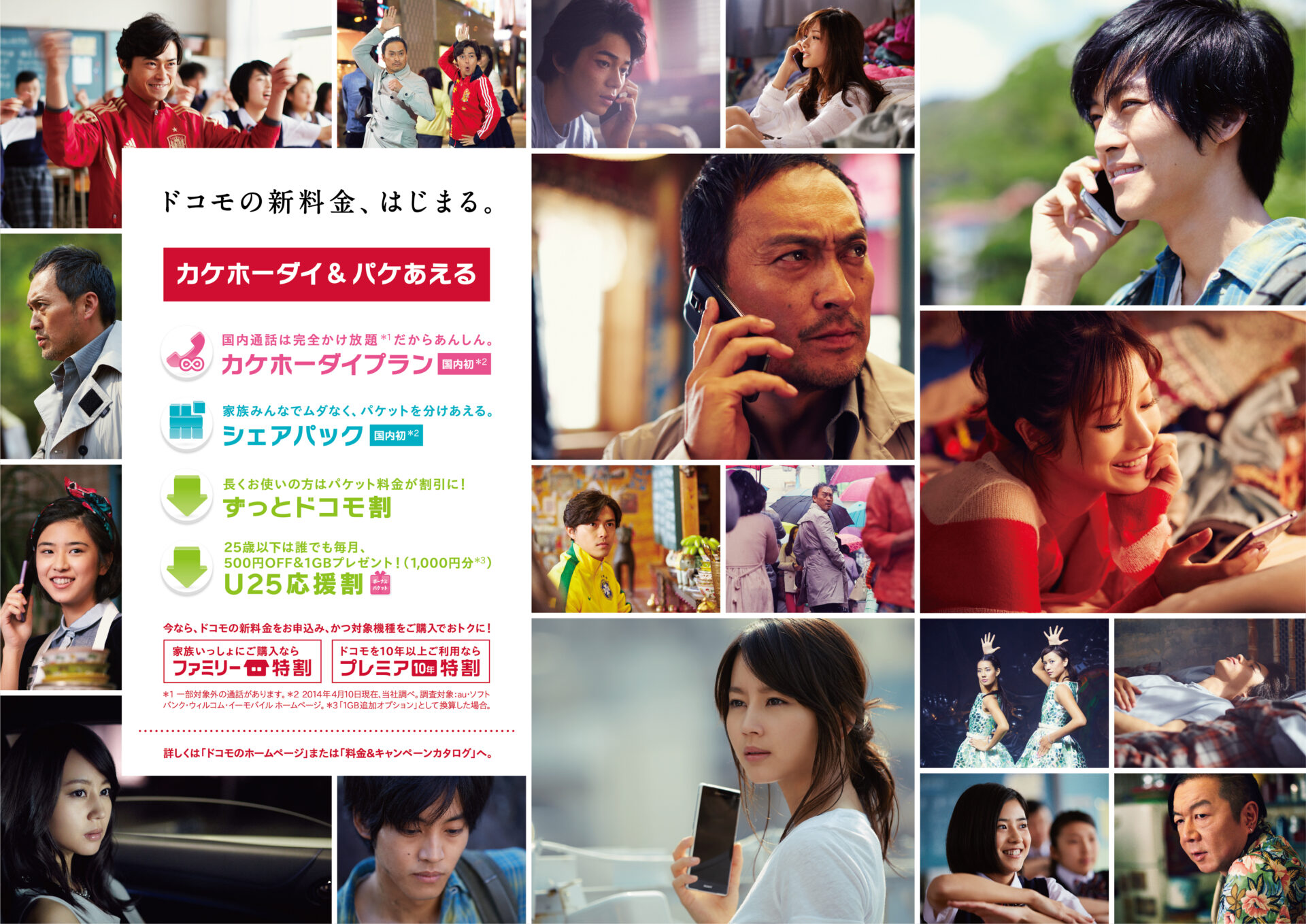 Designer : toruIMAI CreativeDirector : TUGBOAT ArtDirector : kengoKATO CopyWriter : norihisaDohmen Photographer : takakazuAOYAMA Actor : kenWATANABE,makiHORIKITA,toriMATSUZAKA,satomiISHIHARA,arataFURUTA,masahiroHIGASHIDE,yuinaKUROSHIMA,ryoKATSUCHI,SUMIRE Advertising LEAFLET NTT Telecommunications TUGBOAT NTTdocomo : ドコモの新料金