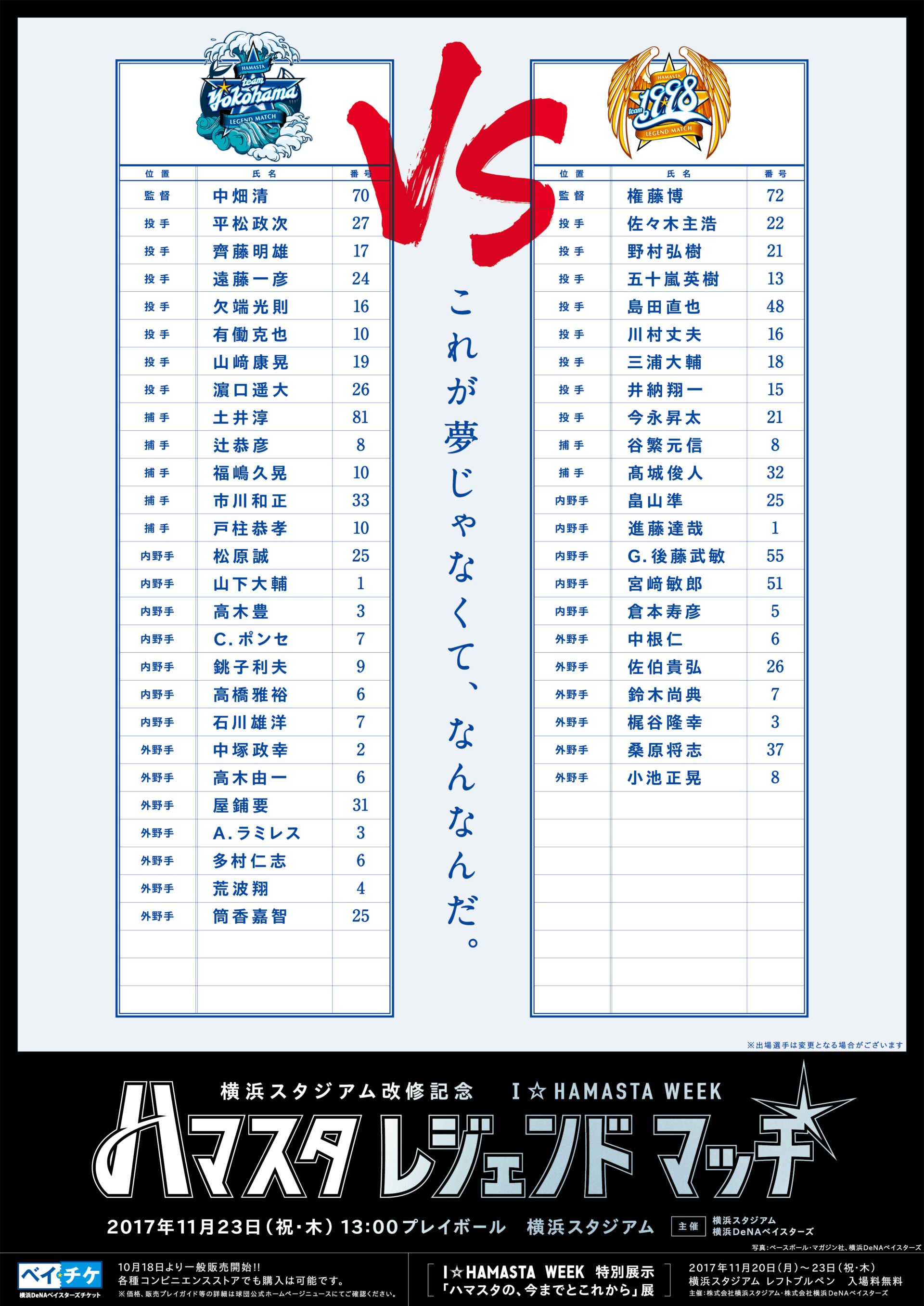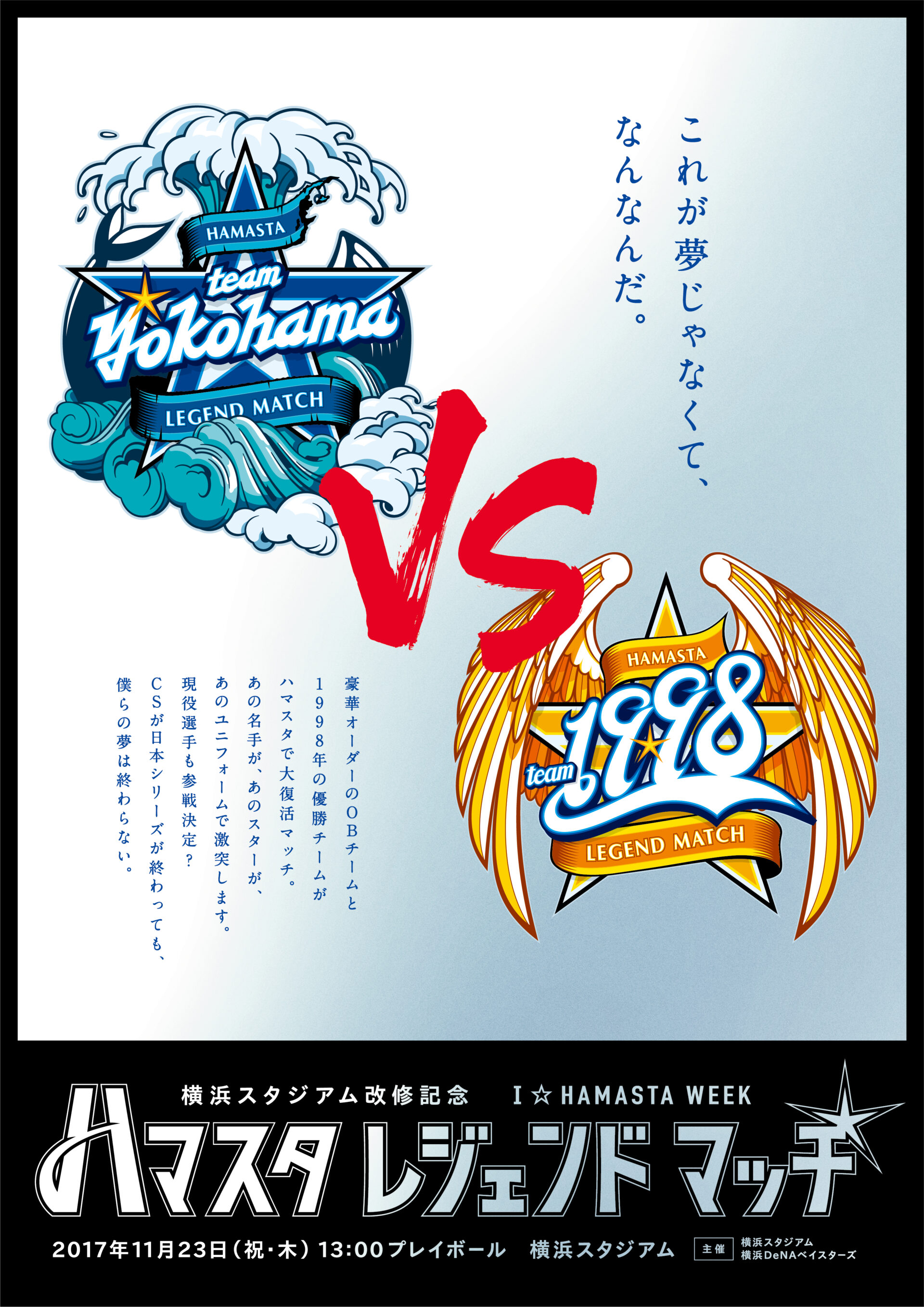 Designer : toruIMAI CreativeDirector : yasumichiOKA ArtDirector : kengoKATO CopyWriter : kojiAKAGI Advertising LEAFLET poster sports TUGBOAT YOKOHAMA DeNA BAYSTARS YOKOHAMA DeNA BAYSTARS : HAMASTA LEGEND MATCH
