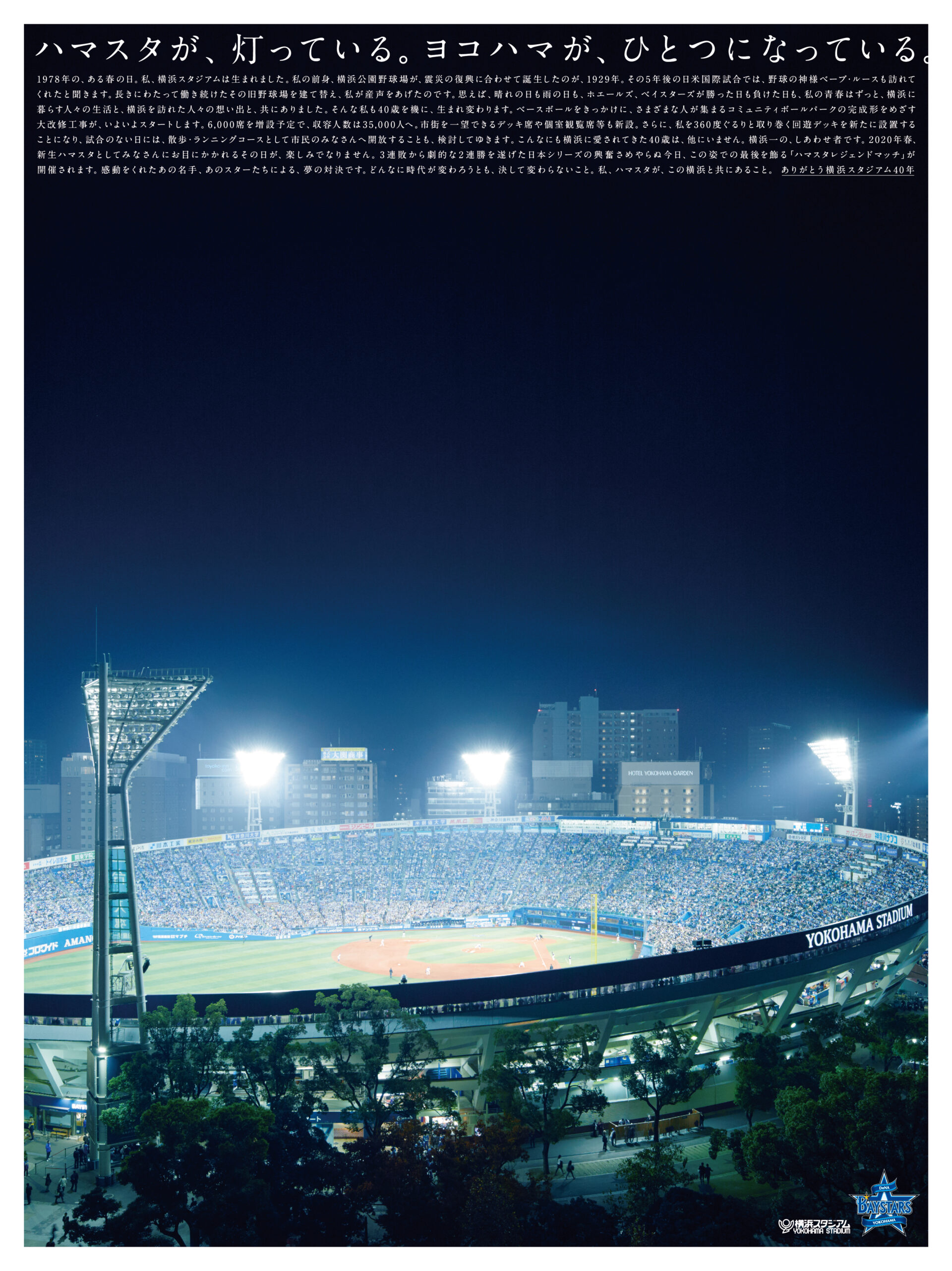 Designer : toruIMAI CreativeDirector : yasumichiOKA ArtDirector : kengoKATO Photographer : kenichiHIGUCHI CopyWriter : kojiAKAGI Advertising Magazine Newspaper sports TUGBOAT YOKOHAMA DeNA BAYSTARS YOKOHAMA DeNA BAYSTARS : HAMASTA 40th