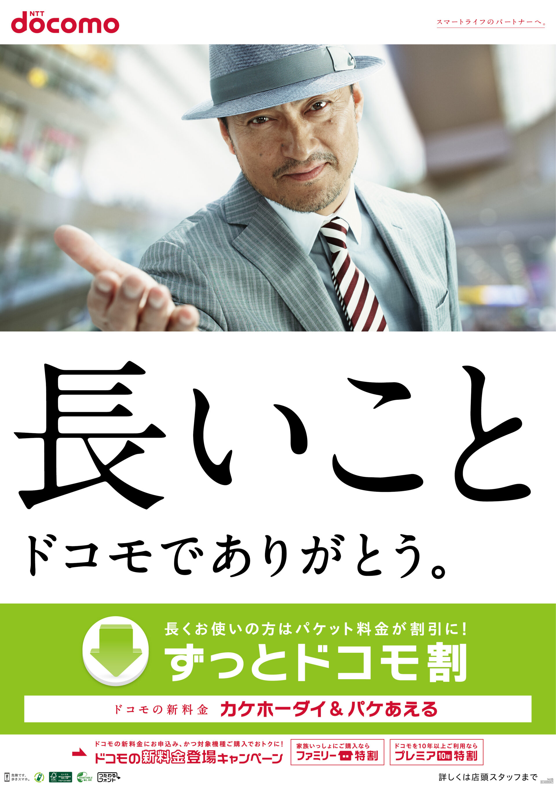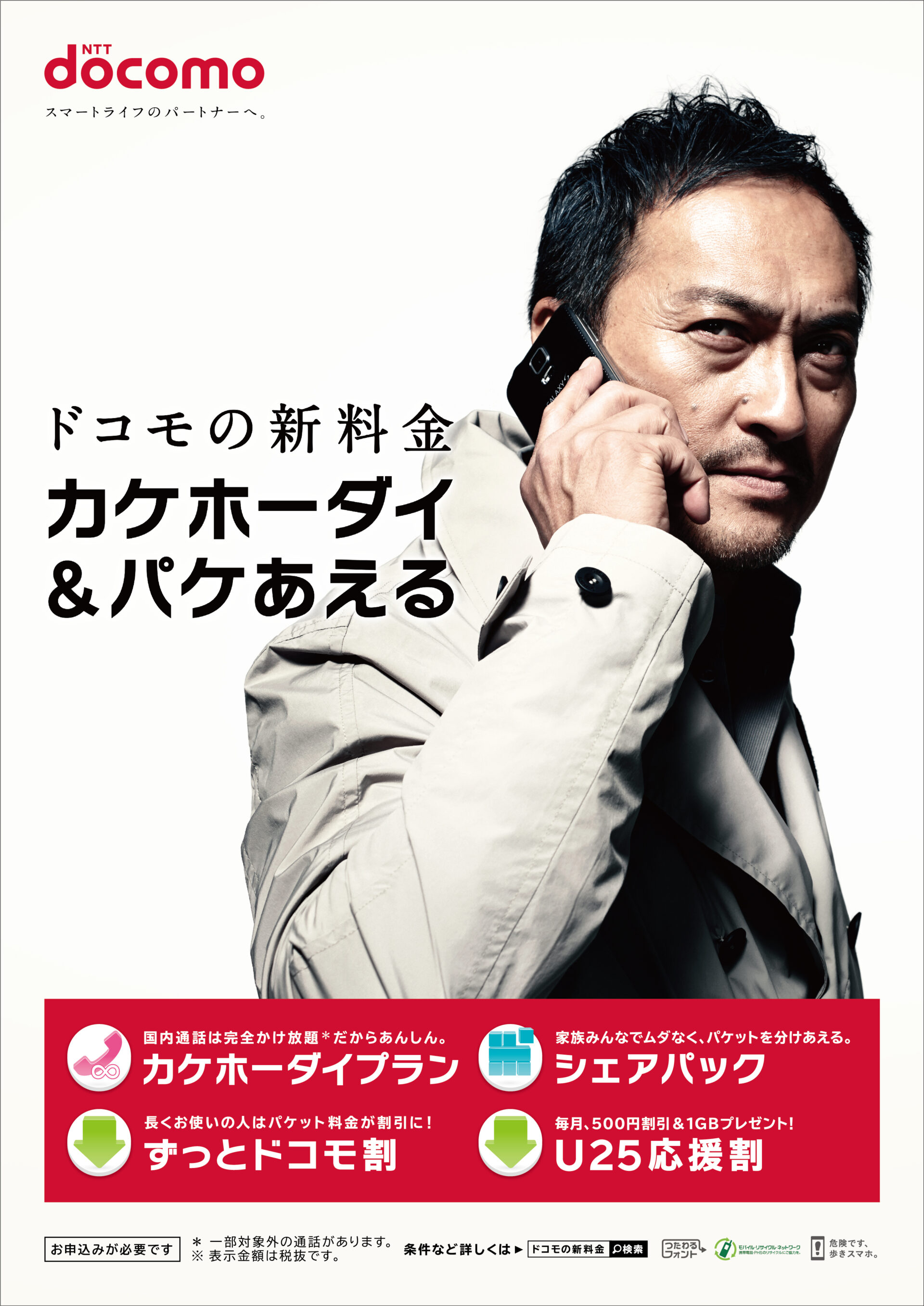 Designer : toruIMAI CreativeDirector : TUGBOAT ArtDirector : kengoKATO CopyWriter : norihisaDohmen Photographer : takakazuAOYAMA Actor : kenWATANABE Advertising NTT poster Telecommunications TUGBOAT NTTdocomo : ドコモの新料金