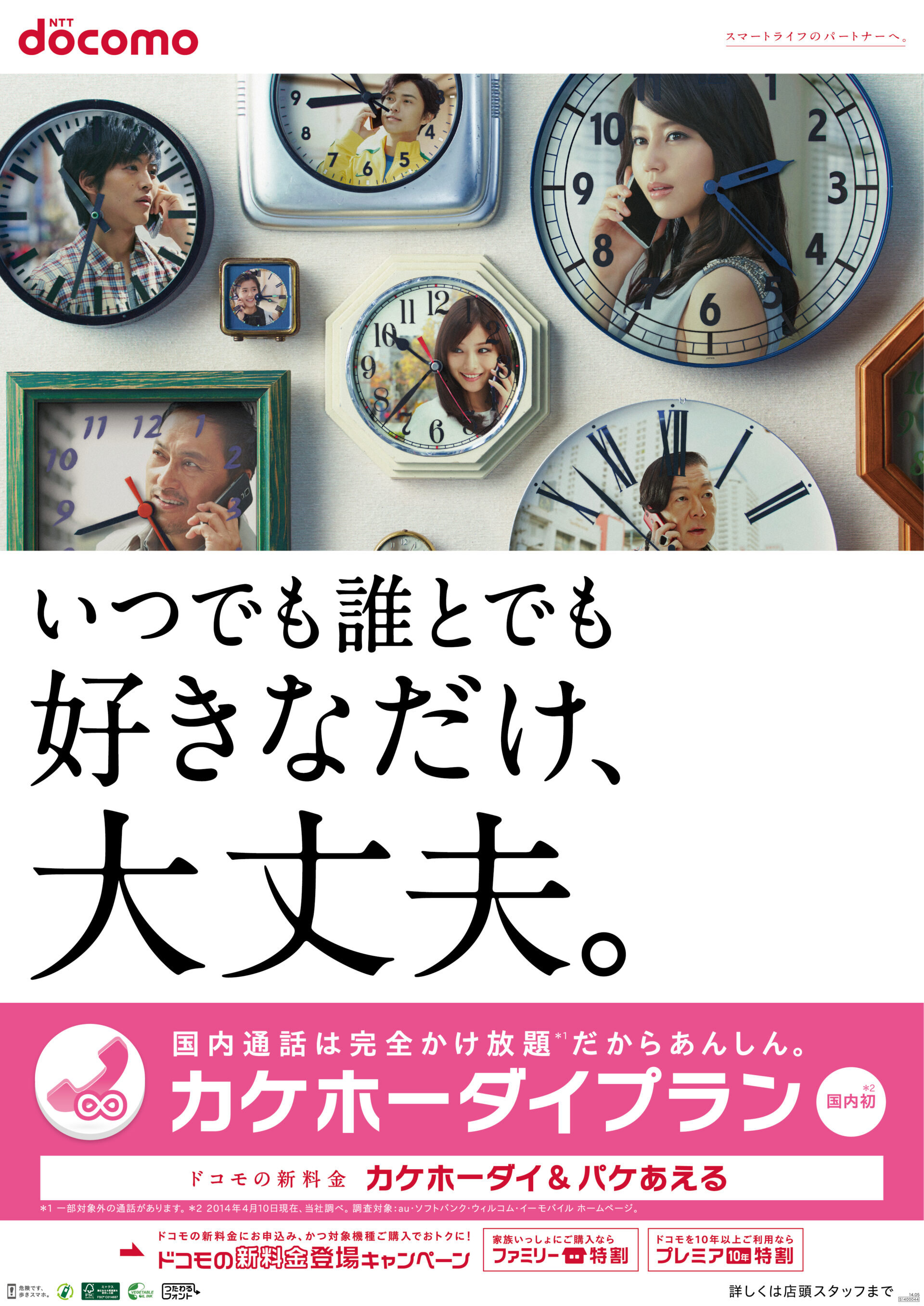 Designer : toruIMAI CreativeDirector : TUGBOAT ArtDirector : kengoKATO CopyWriter : norihisaDohmen Photographer : takakazuAOYAMA Actor : kenWATANABE,makiHORIKITA,toriMATSUZAKA,satomiISHIHARA,arataFURUTA,masahiroHIGASHIDE,yuinaKUROSHIMA,ryoKATSUCHI,SUMIRE Advertising NTT poster Telecommunications TUGBOAT NTTdocomo : ドコモの新料金