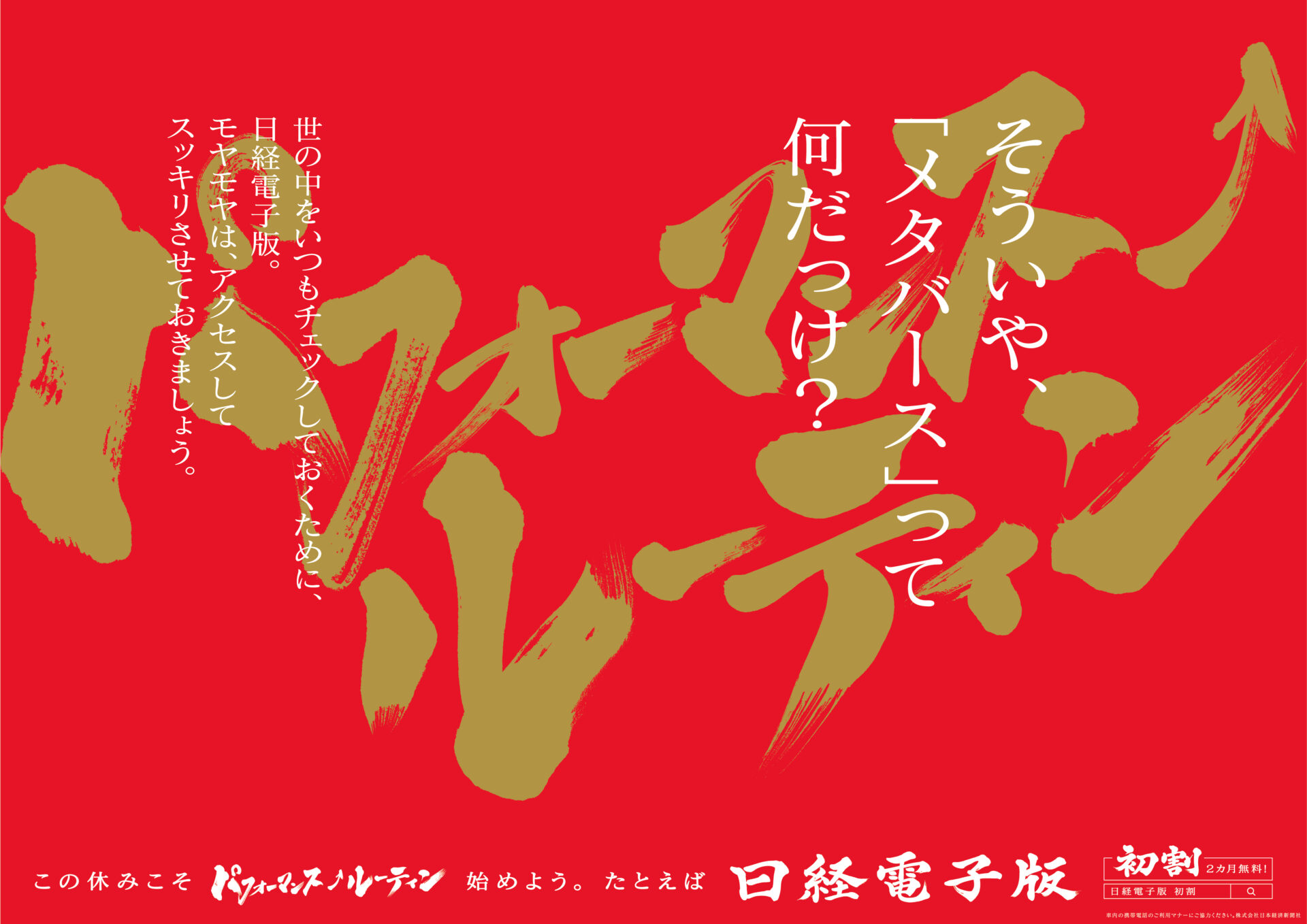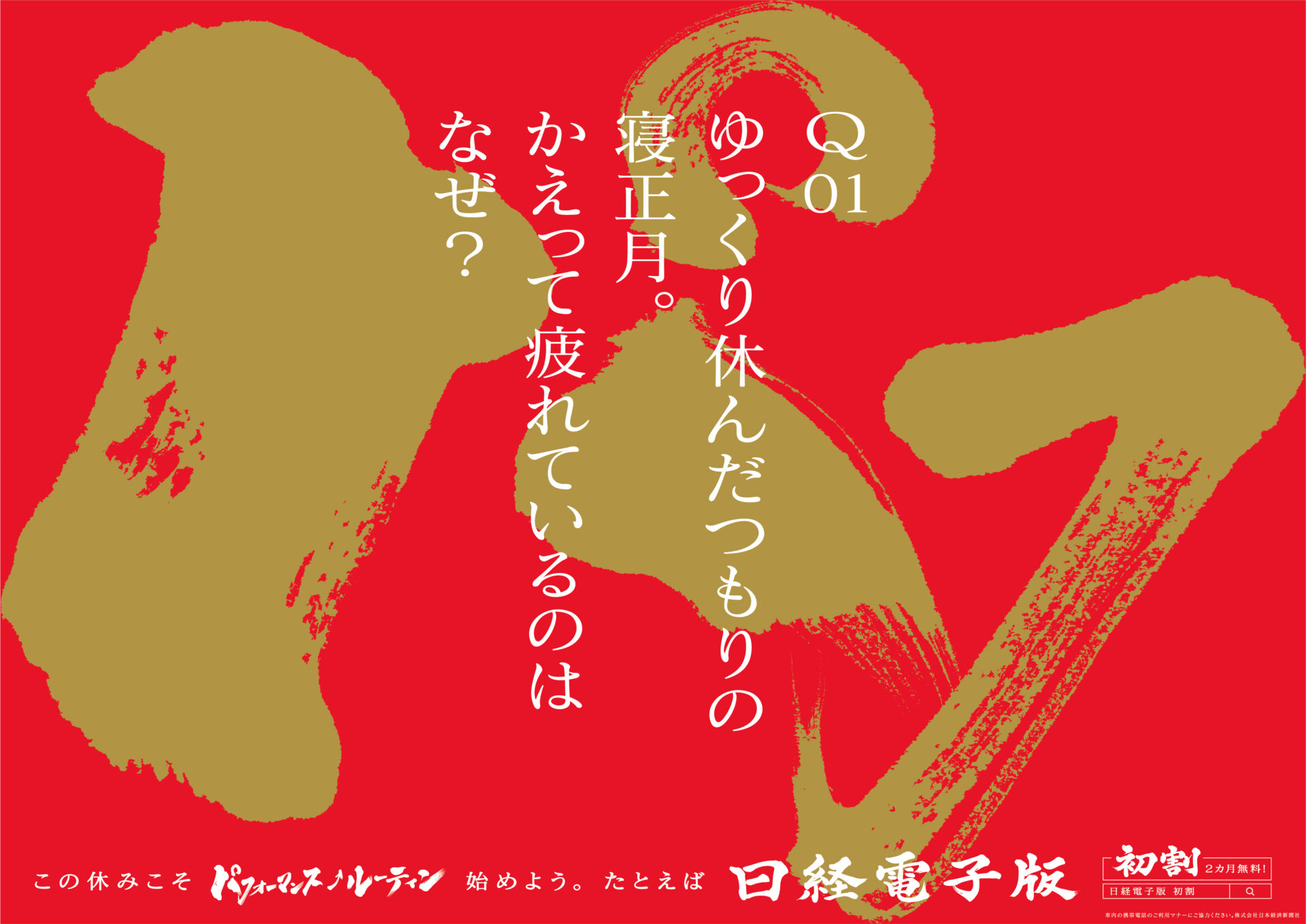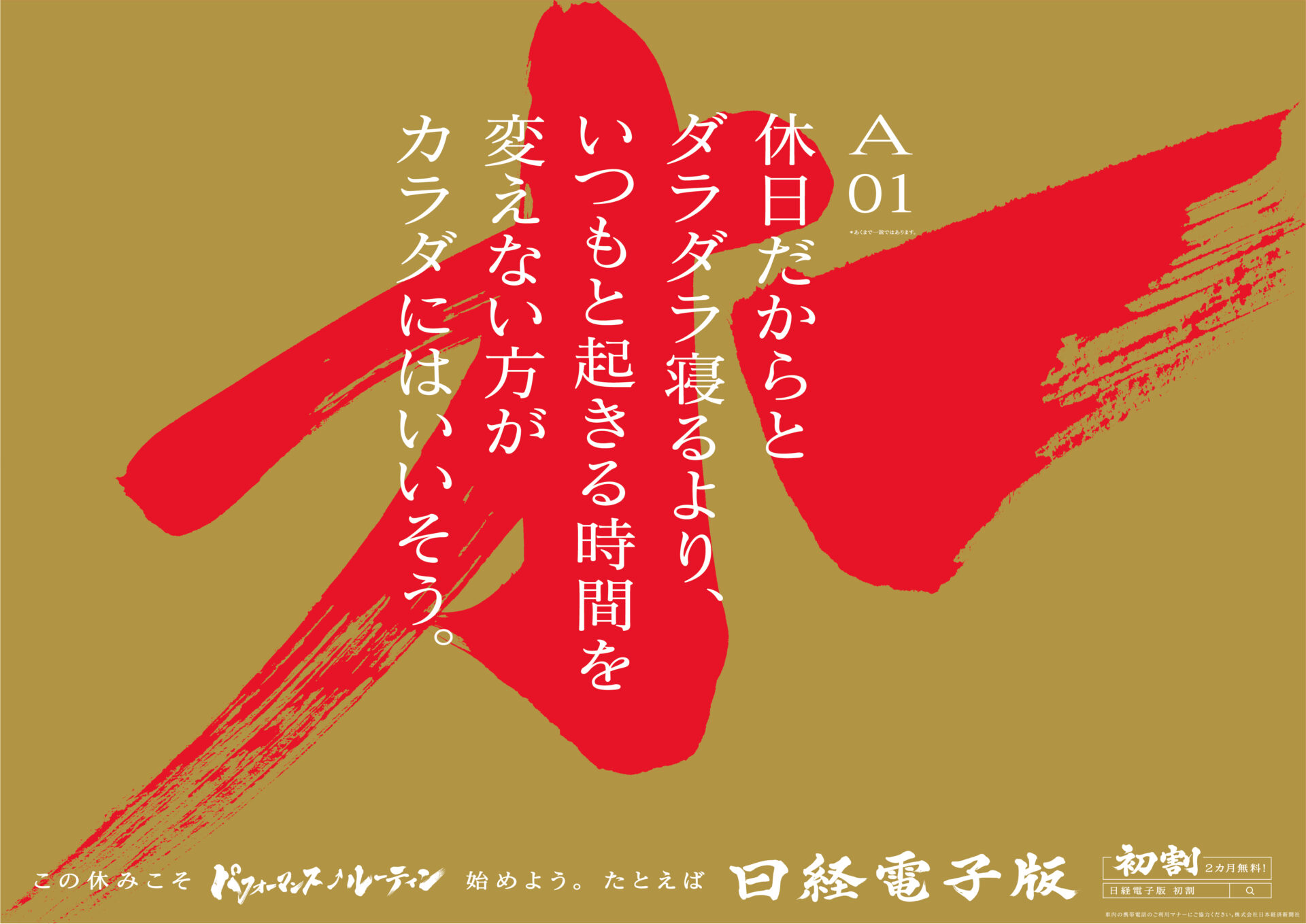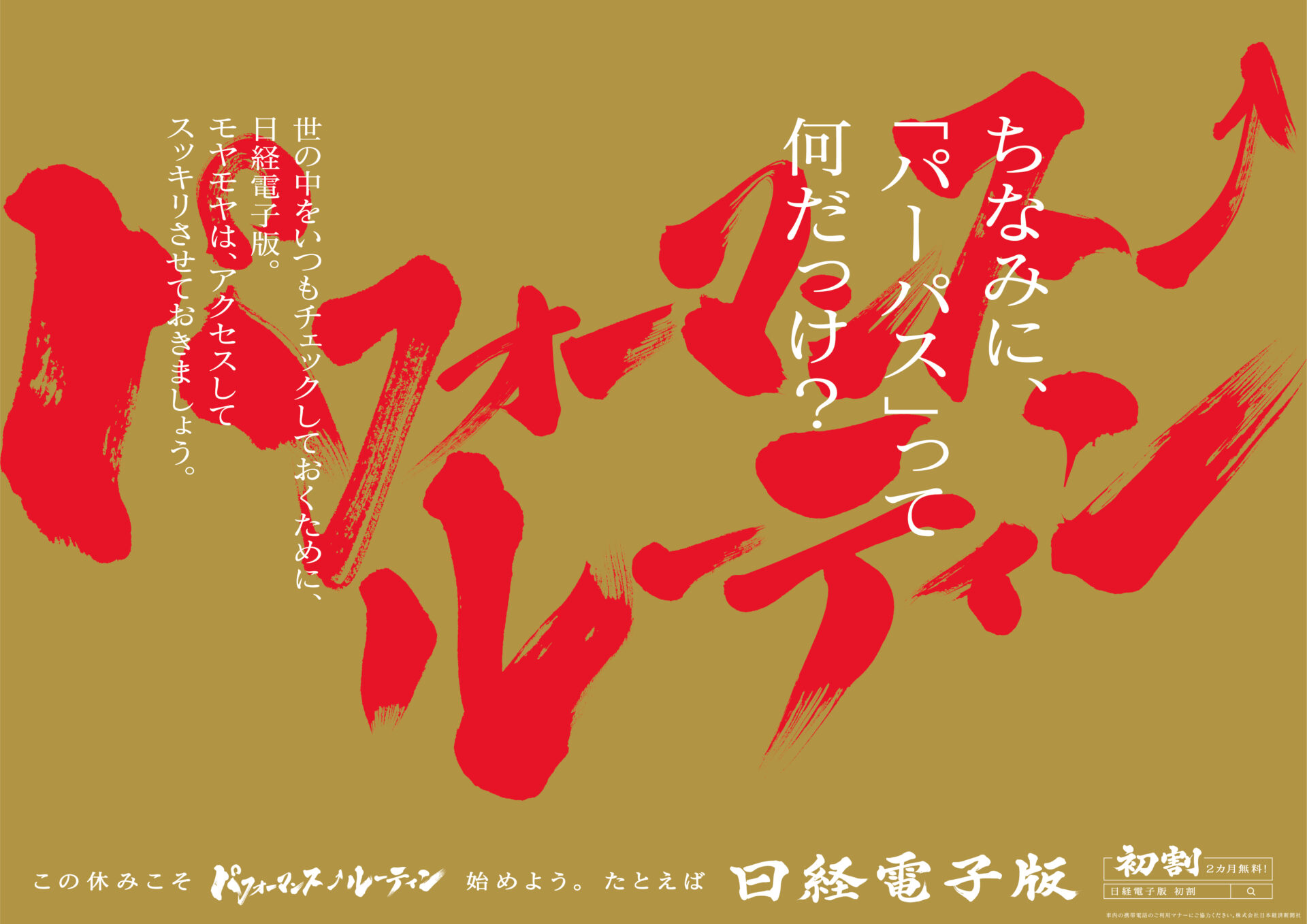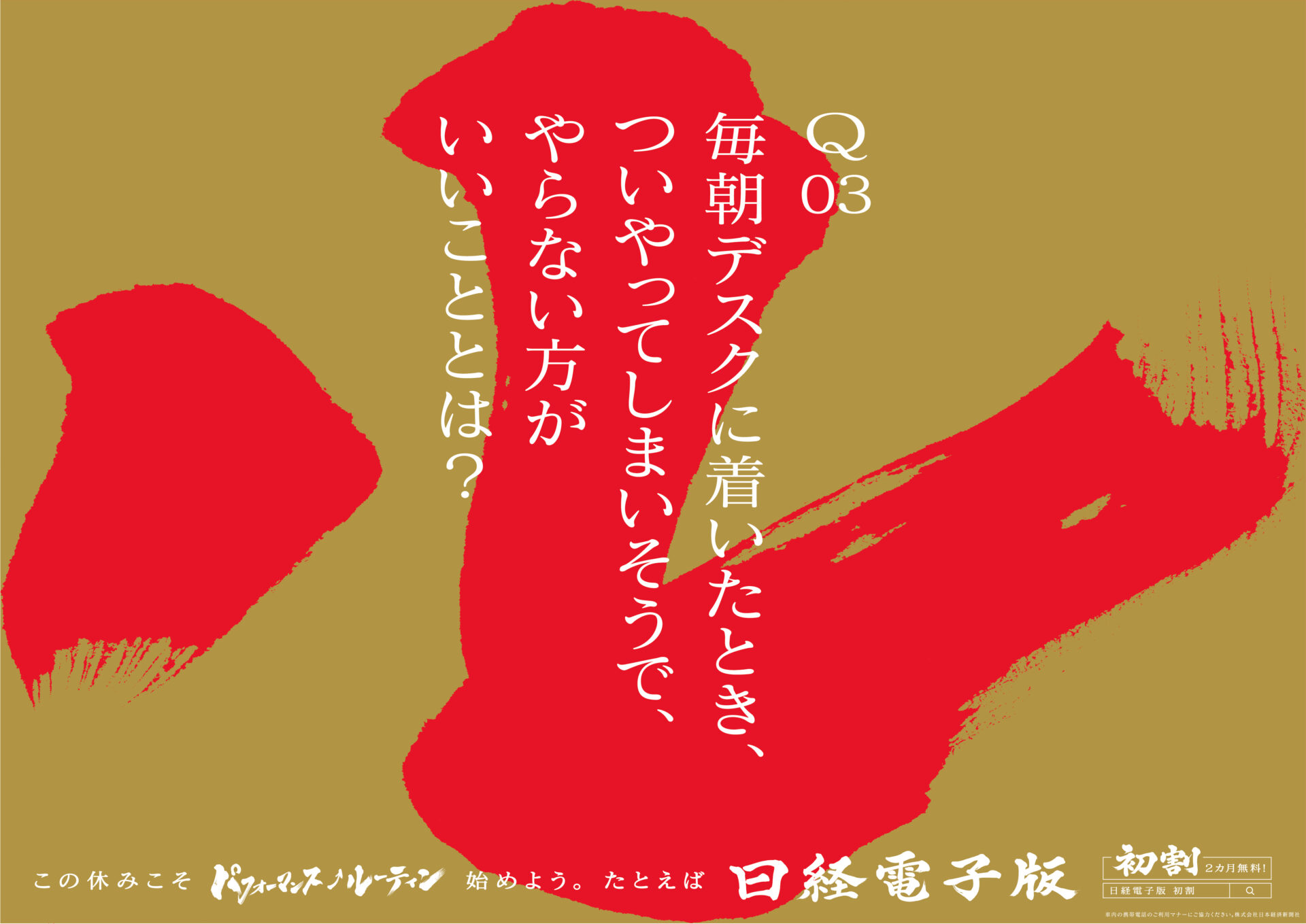 Designer : toruIMAI CreativeDirector : norihisaDOHMEN ArtDirector : kengoKATO CopyWriter : norihisaDOHMEN ArtWork(Text): megumiHIOKI Advertising etc poster publishing TUGBOAT NIKKEI : performance