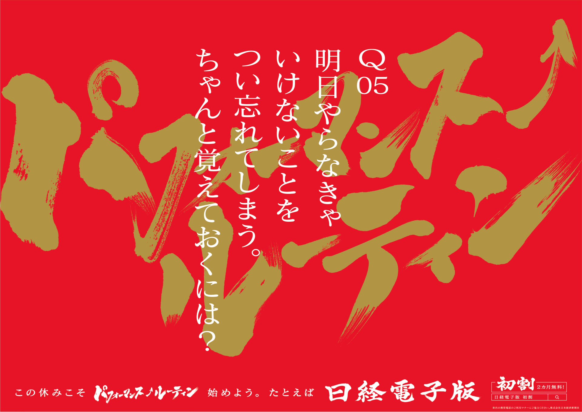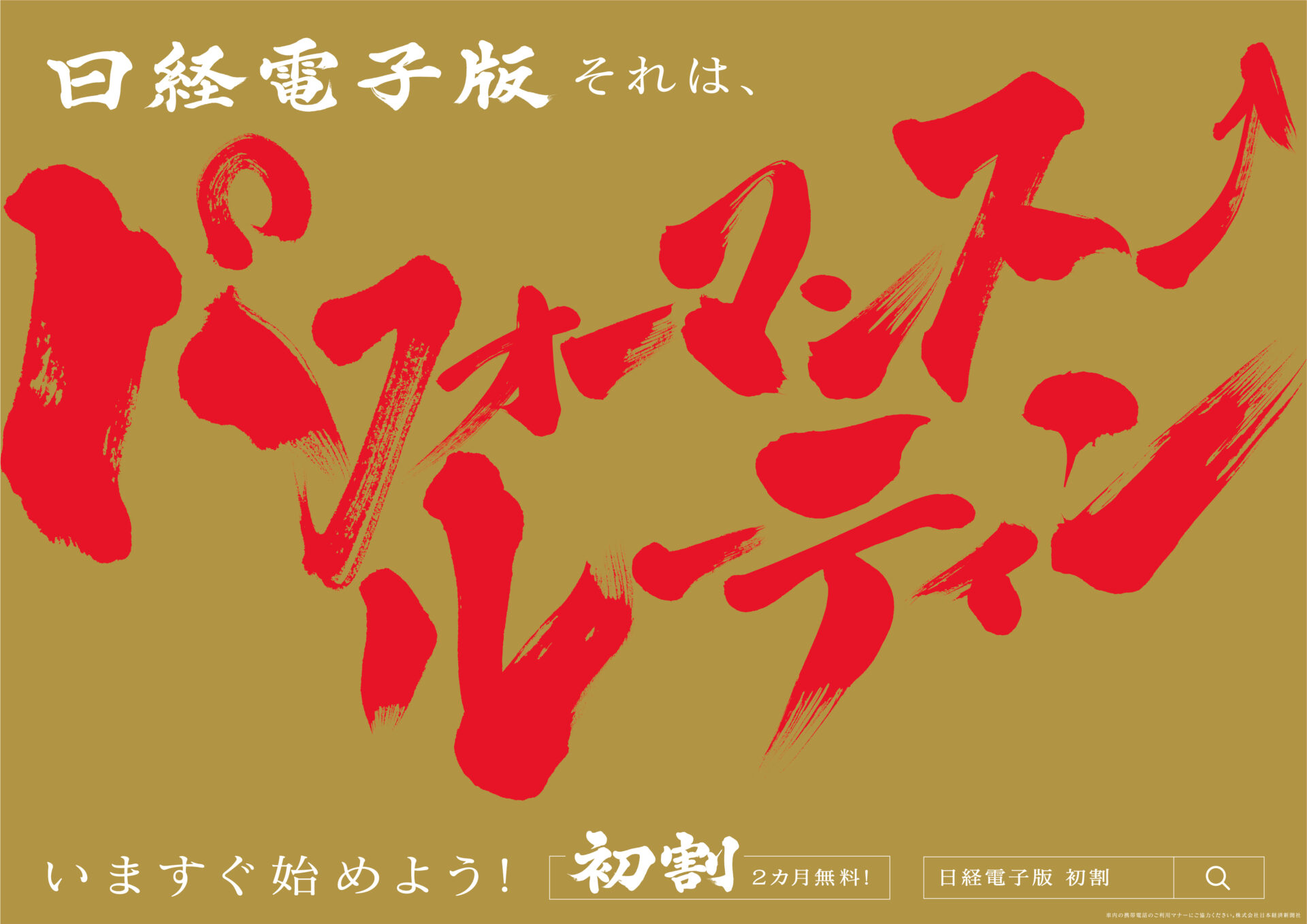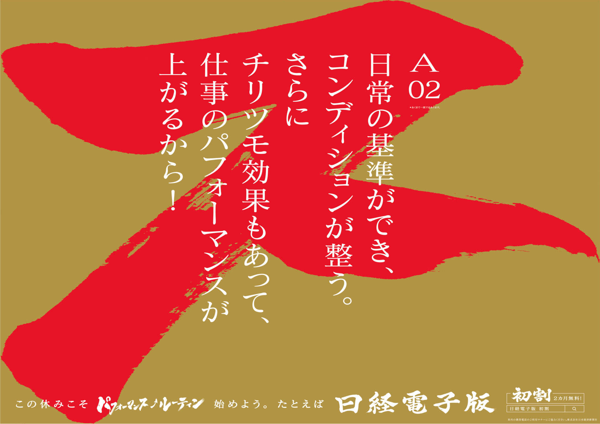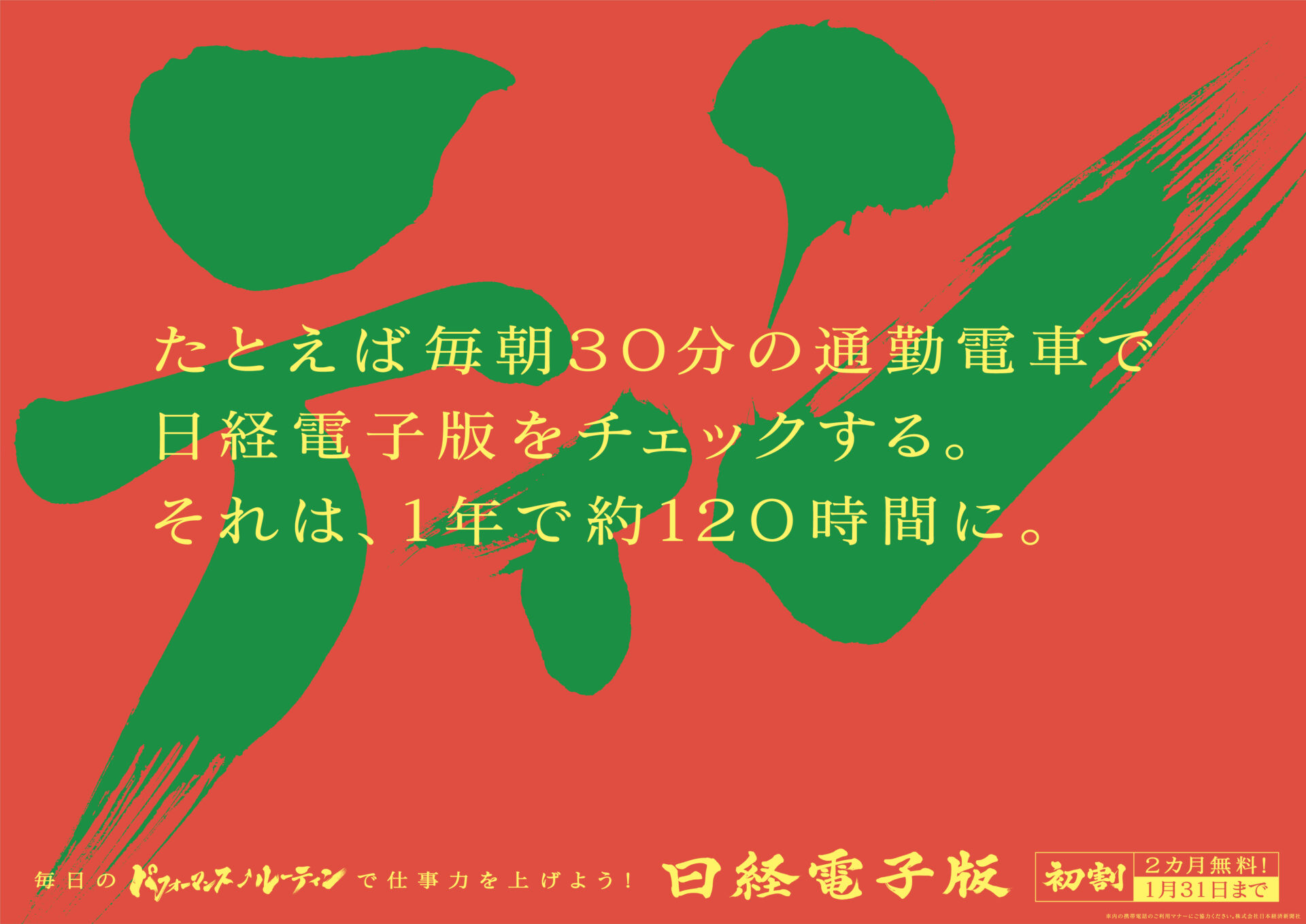 Designer : toruIMAI CreativeDirector : norihisaDOHMEN ArtDirector : kengoKATO CopyWriter : norihisaDOHMEN ArtWork(Text): megumiHIOKI Advertising etc poster publishing TUGBOAT NIKKEI : performance