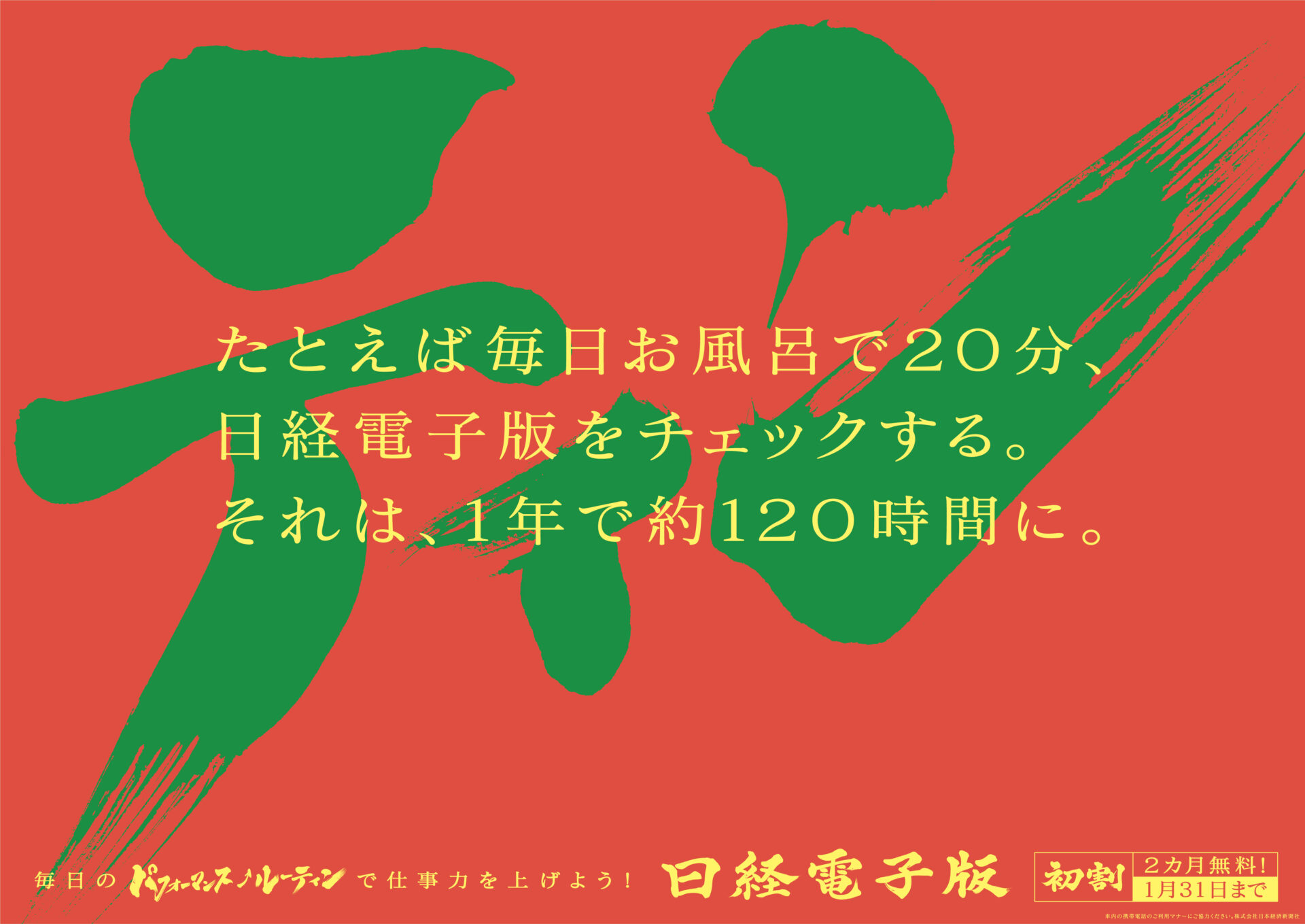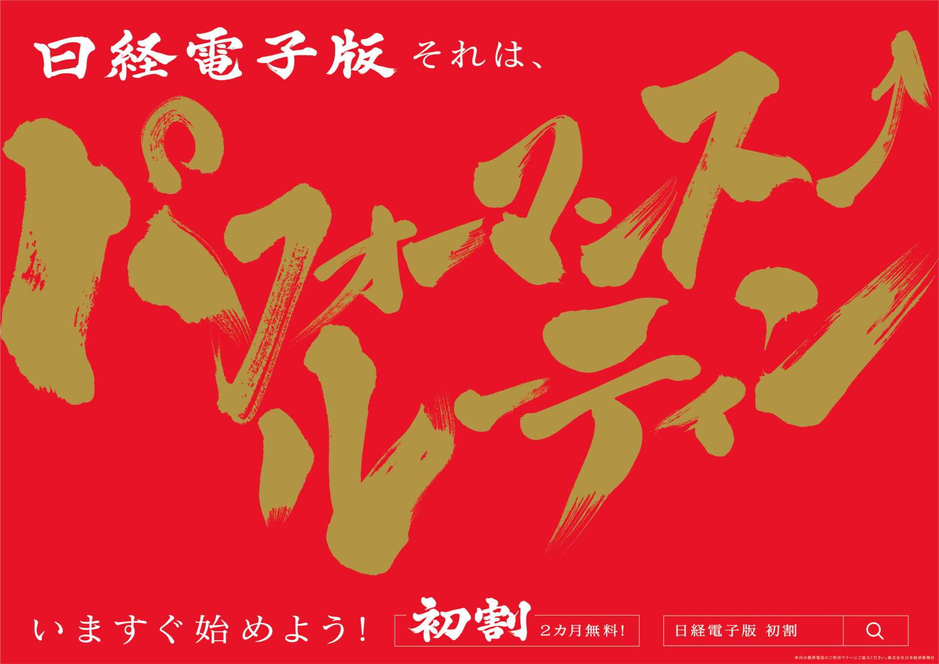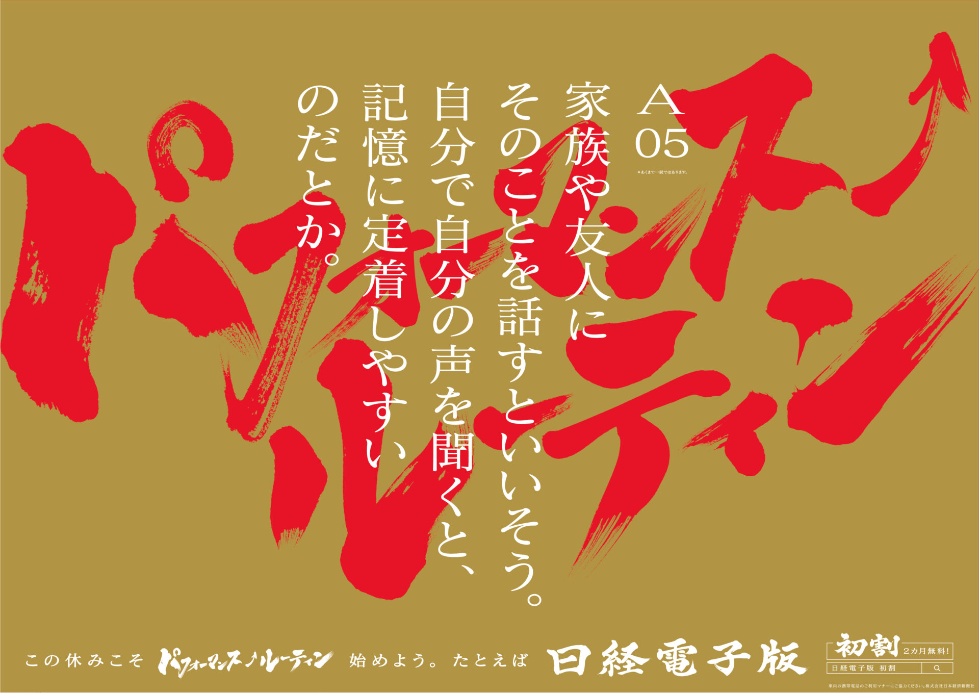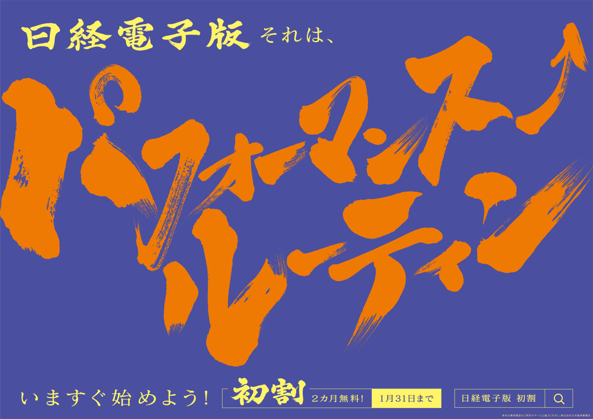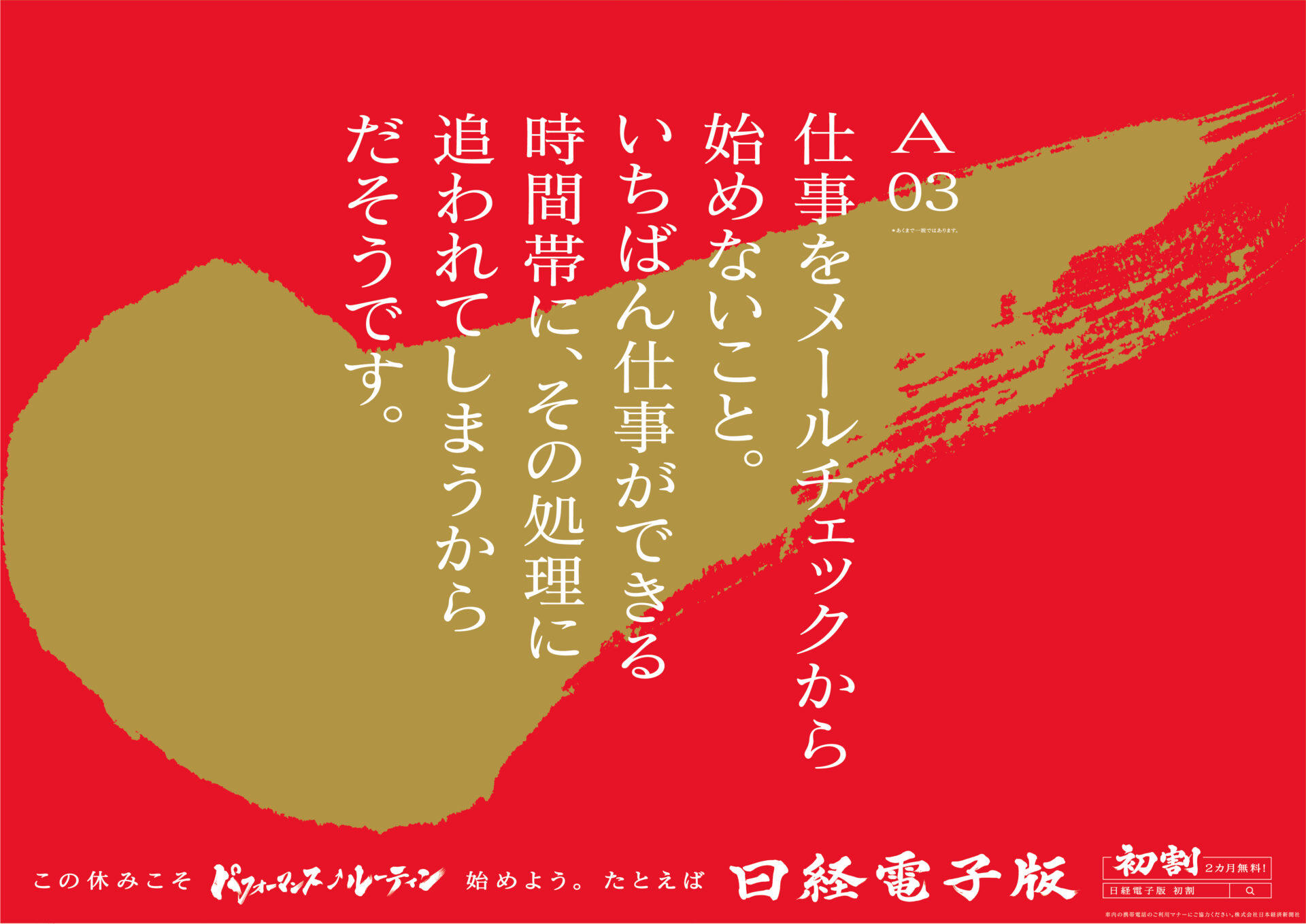 Designer : toruIMAI CreativeDirector : norihisaDOHMEN ArtDirector : kengoKATO CopyWriter : norihisaDOHMEN ArtWork(Text): megumiHIOKI Advertising etc poster publishing TUGBOAT NIKKEI : performance